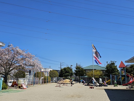 こいのぼりが空を泳ぐと、指差ししたり、「おさかな!」と声に出して"見つけたよ"と教えてくれます。こいのぼりを見つけると、泣いていた子も涙がピタリ。これから5月まで、天気のいい日は毎日空からこどもたちを見守ってくれる予定です。