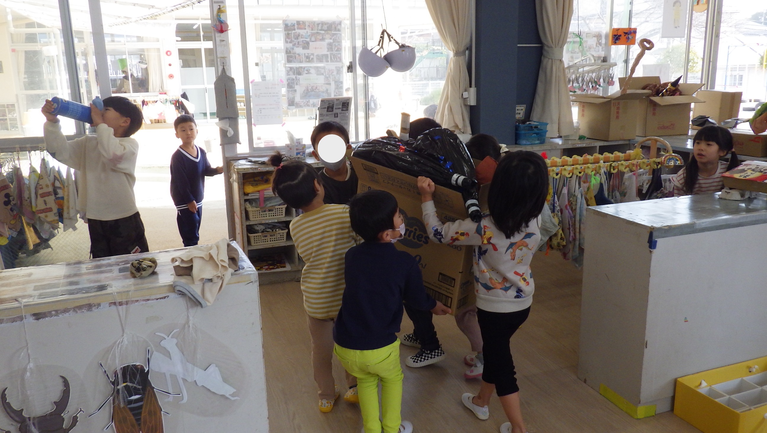 劇の小道具作りも進んできて、同じように真似をして作る子もいます。少し難しいなと思うことでも一緒に作っているうちに覚えてきて、次に始めた友だちにも「こうするんだよ」と教えてあげる姿にほっこりします。