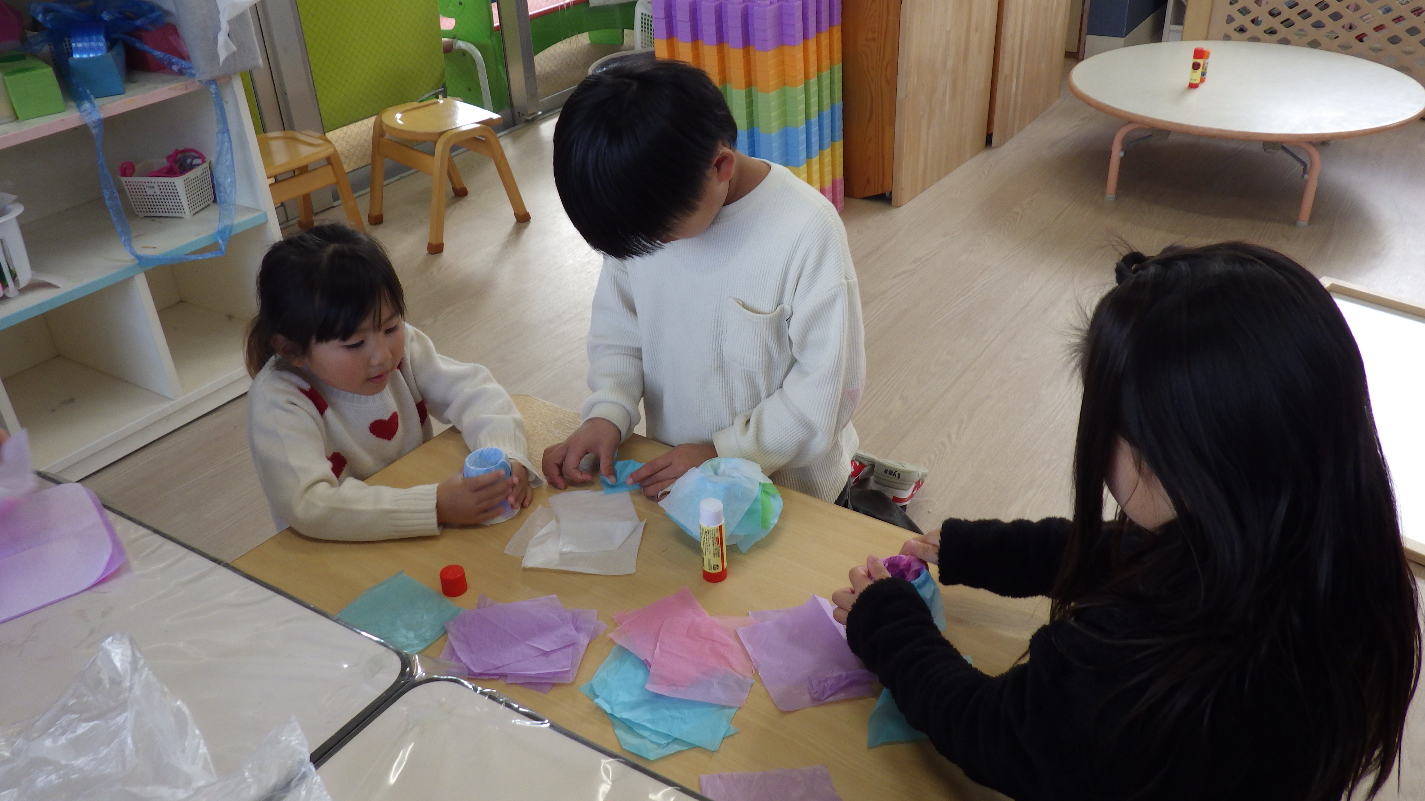 今日も発表会の小道具作りに忙しいにじぐみさんでした。一人が作っていると、みんな見に来ていて興味津々の様子で見ていました。大変そうな様子に「手伝おうか?」と誰がか声をかけ手伝い始めると次々にみんな手伝っていて、あっという間に完成しました!