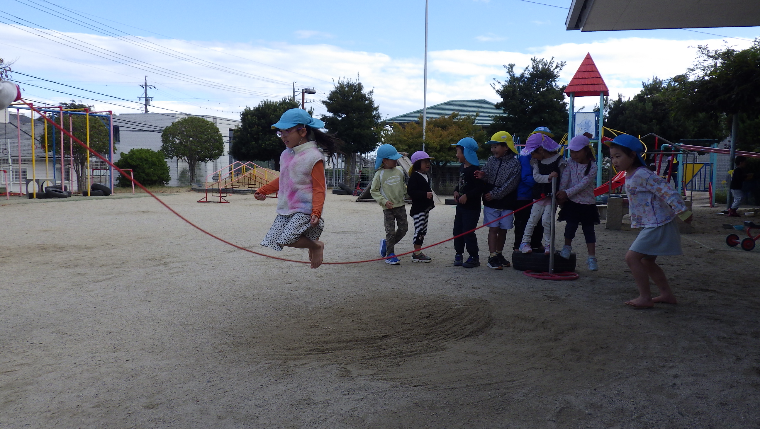 大なわは跳ぶだけでなくて、入り跳びや2~3人で一緒に跳んだりなど色々な跳び方を楽しんでいます。入り跳びが初めての子には入るタイミングを並んでいる子たちが「はいっ!」と声をかけたり、「大丈夫!簡単だよ!」と優しく声をかけてあげていました。声をかけられた子もみんなに言われるとやる気が出てくるようで次々に入り跳びができるようになっていました。友だちパワーってすごいですね☆