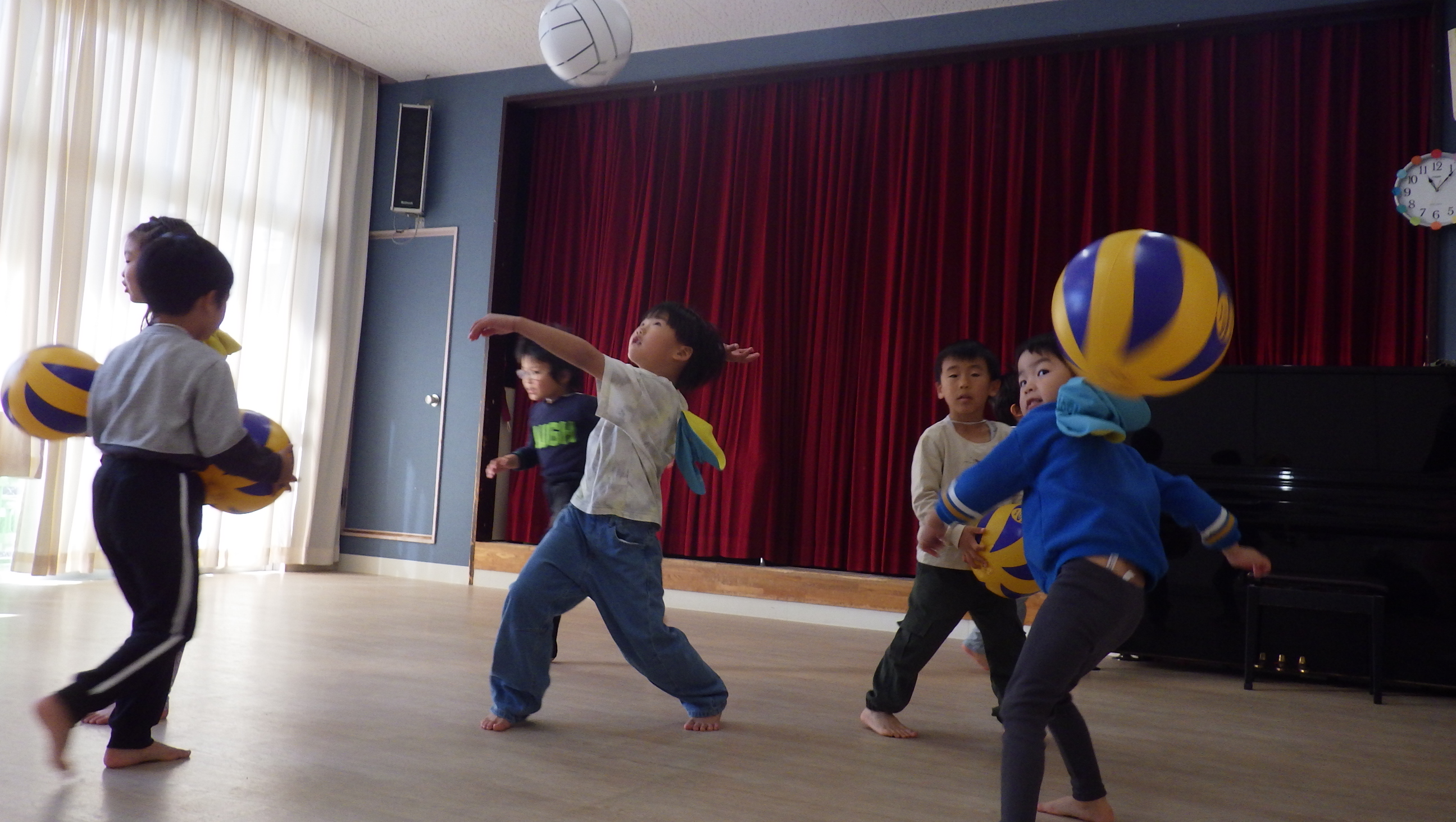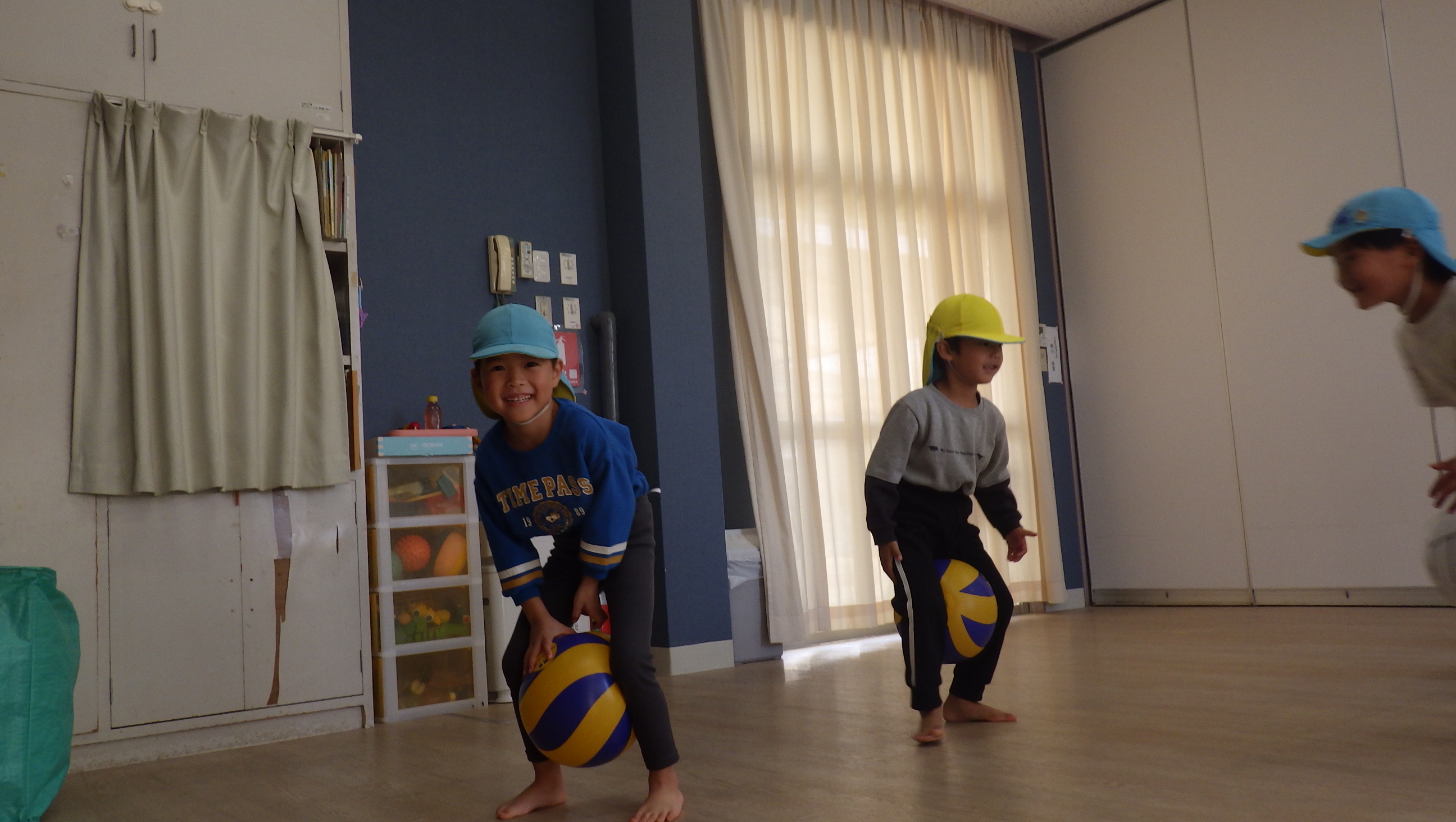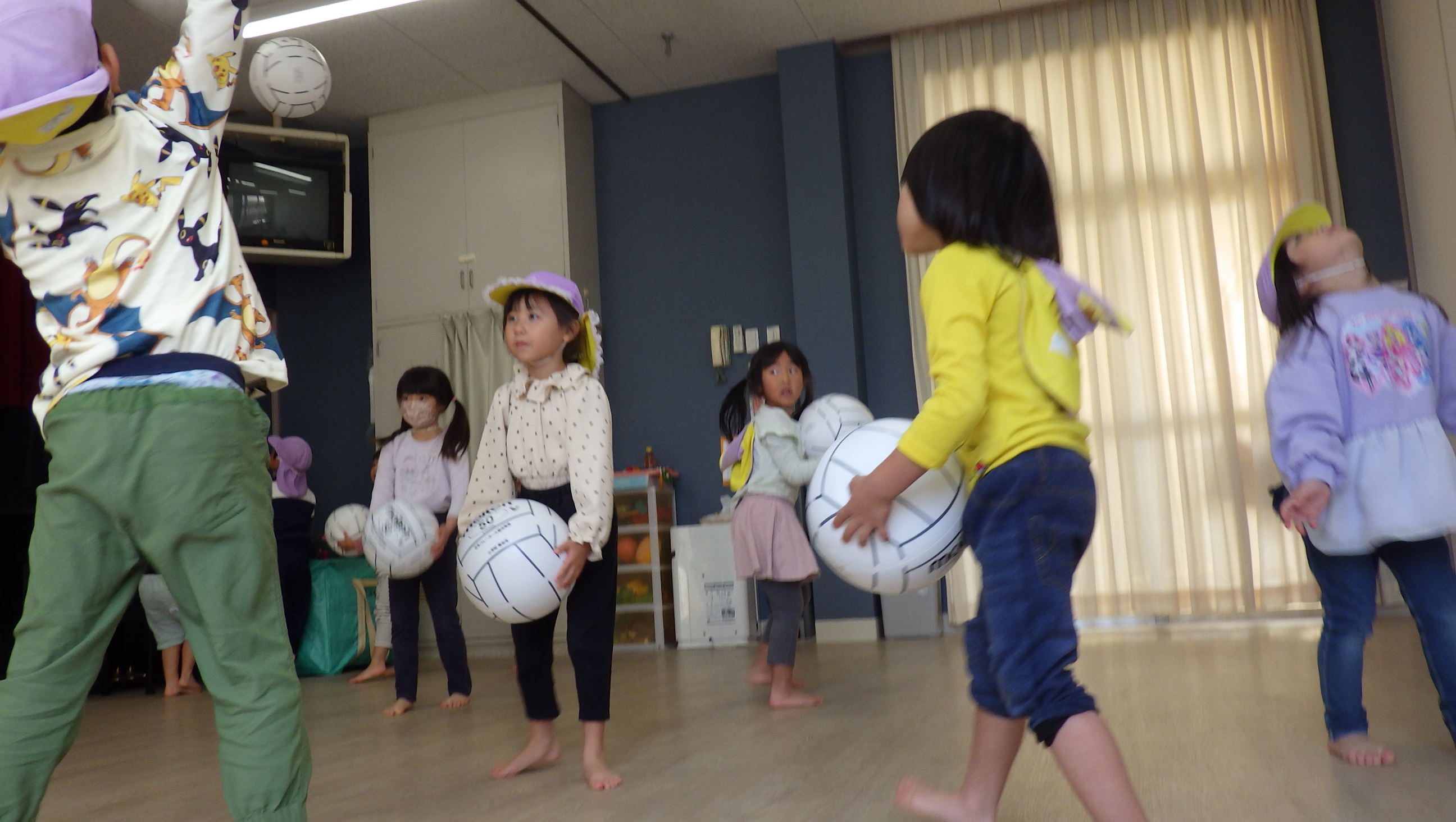 体育教室がありました。みんなの顔よりも大きいビーチボールを足に挟んでジャンプしたり、上に投げてキャッチしたりバレーボールのサーブのように打ってみたりと色々な遊び方にチャレンジしました!うまくできると「見て見て!」と笑顔で見せに来てくれてかわいかったですよ♡