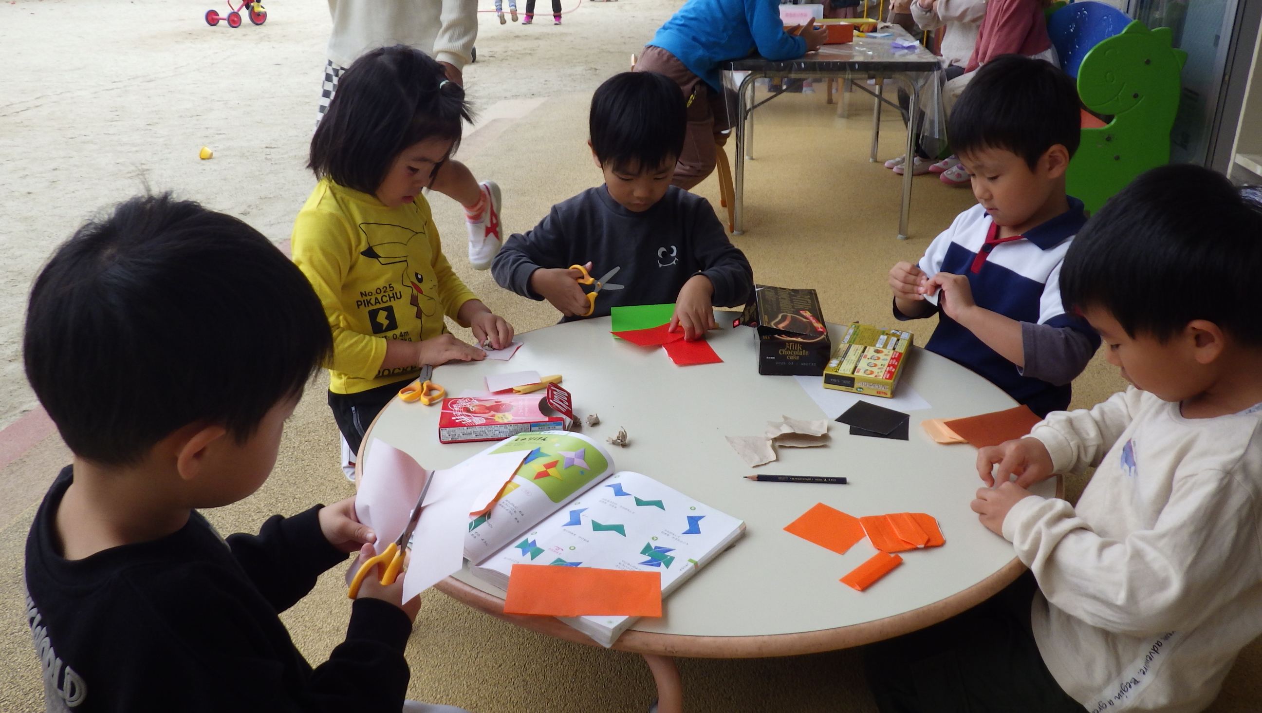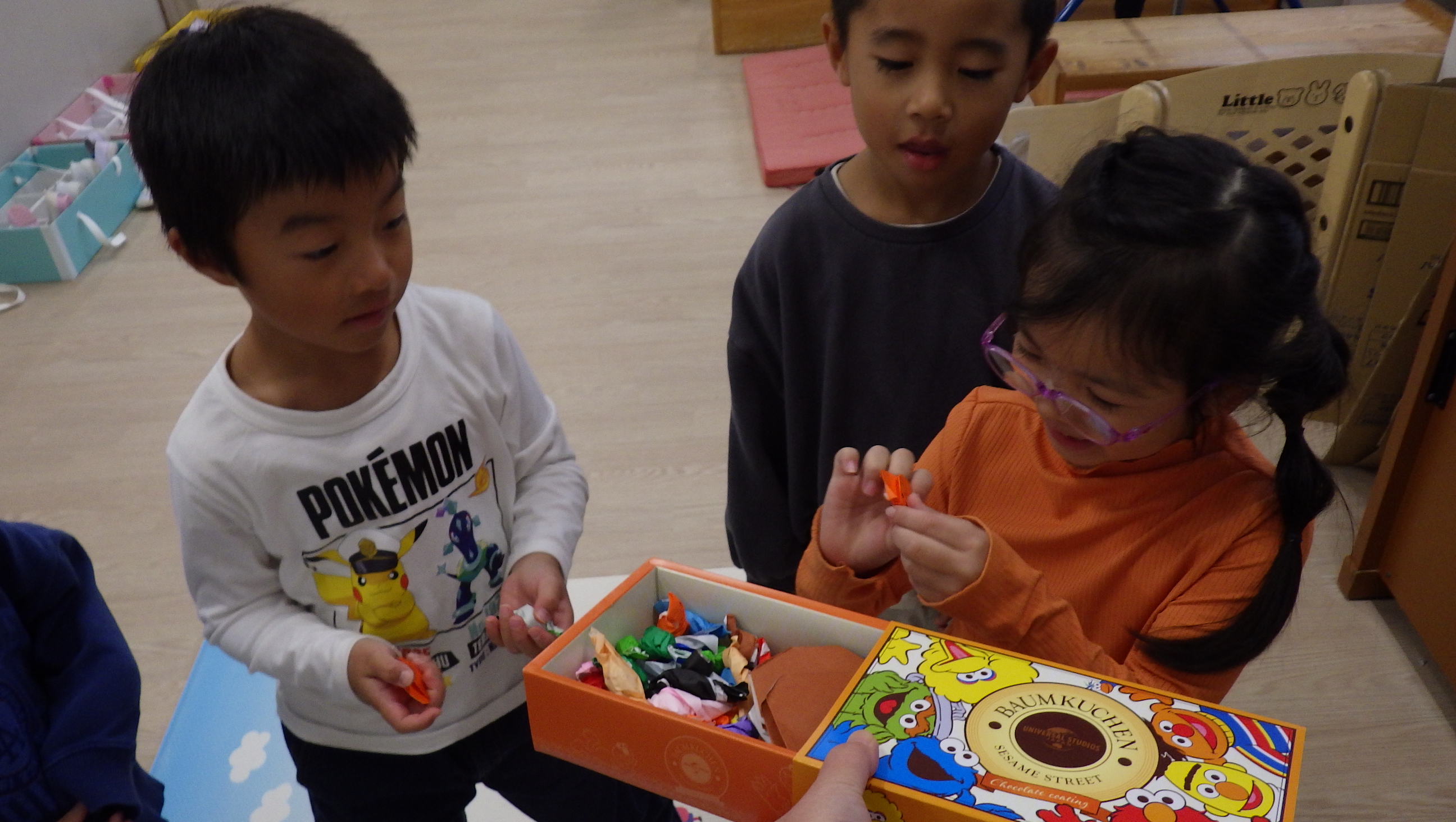 私が折り紙などでキャンディーを作っていると「作りたーい!」と続々とパティシエが集まってきました♡キャンディーだけでなくて、クッキーやマカロンを作っている子もいてビックリ!!こどもの発想っておもしろいですね♪