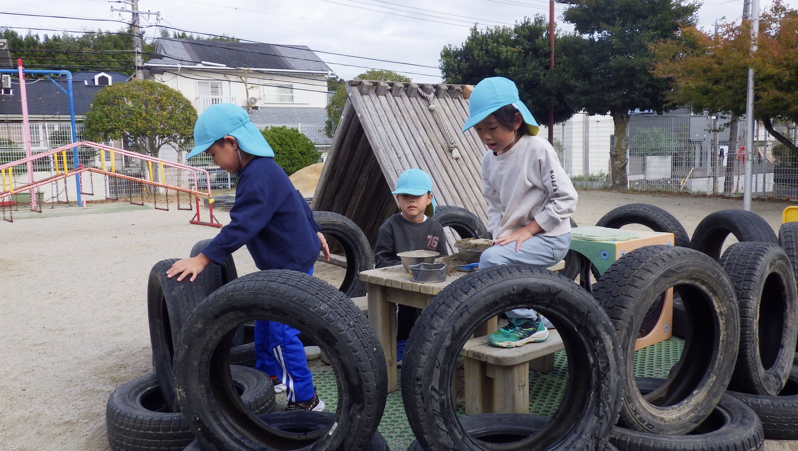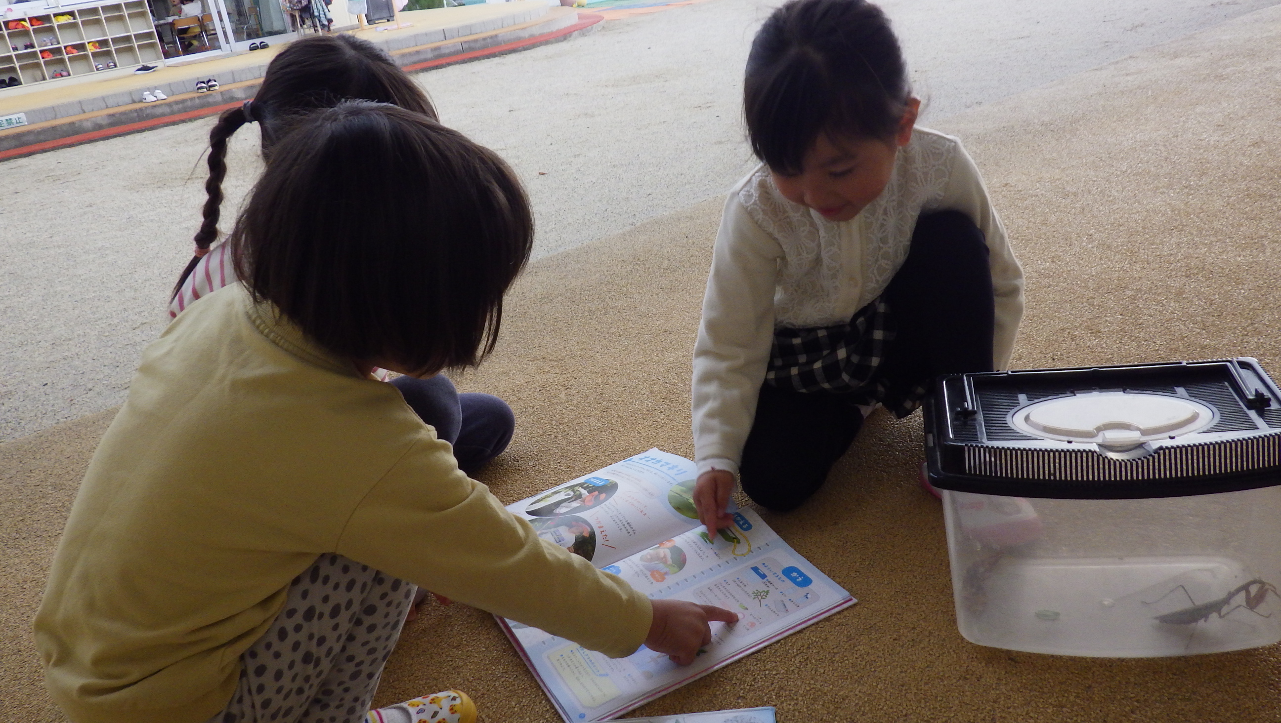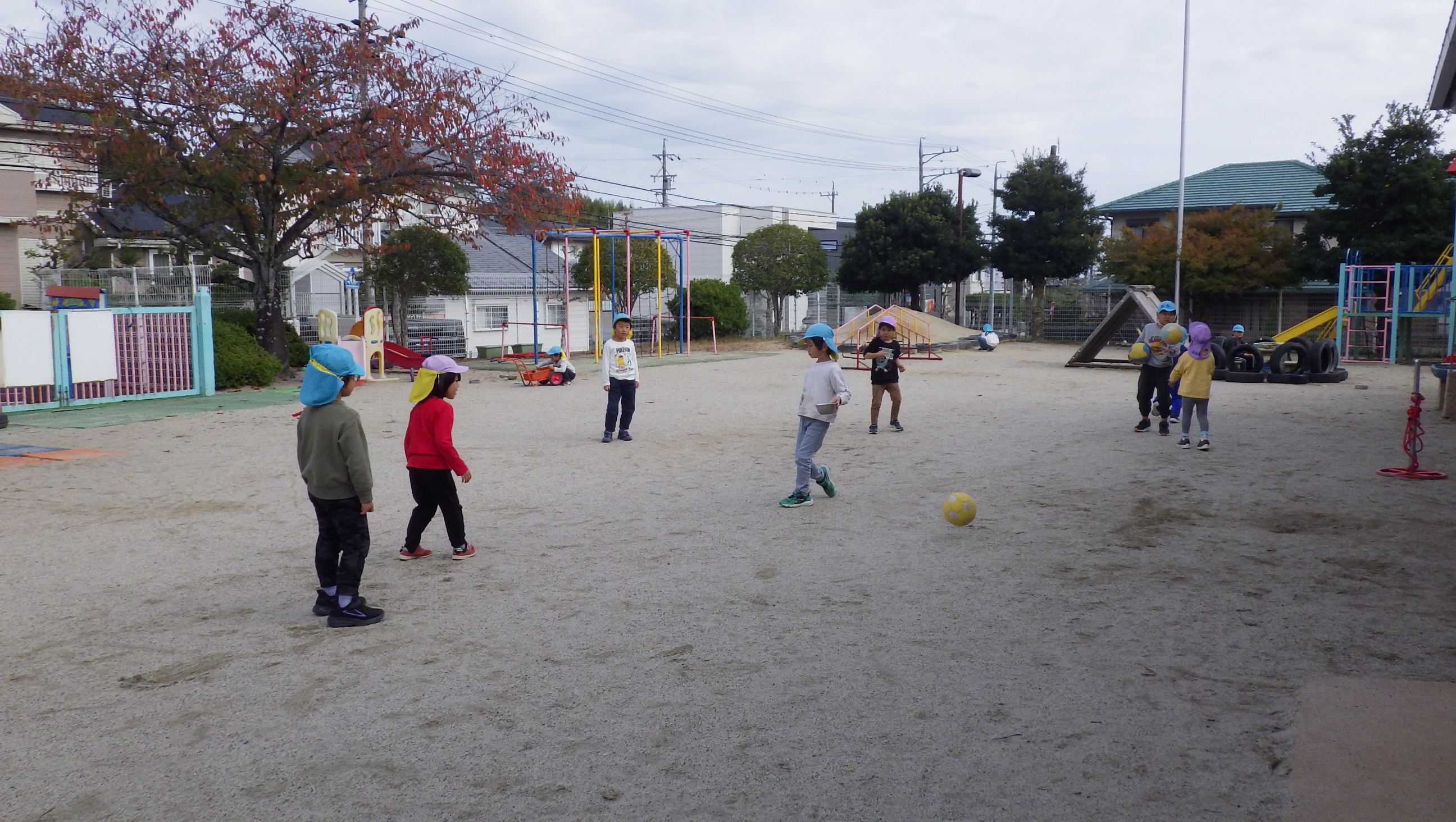 今日は園庭で過ごす子が多く、鬼ごっこからカマキリ探しになったり、みんなでボールを蹴り合ったりしていましたよ。