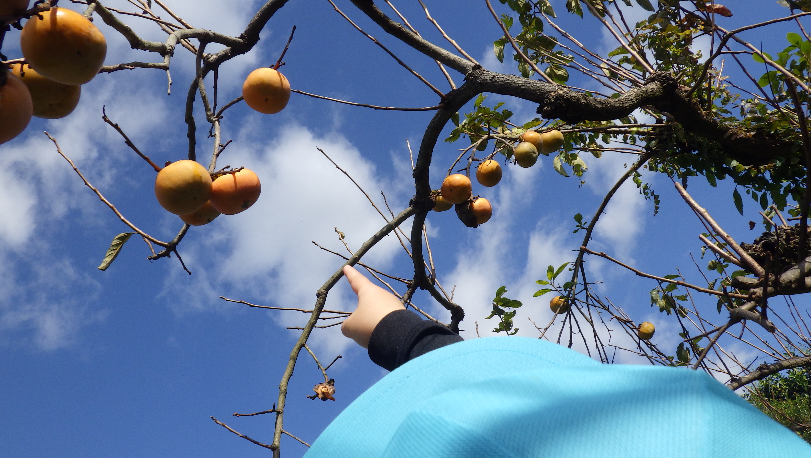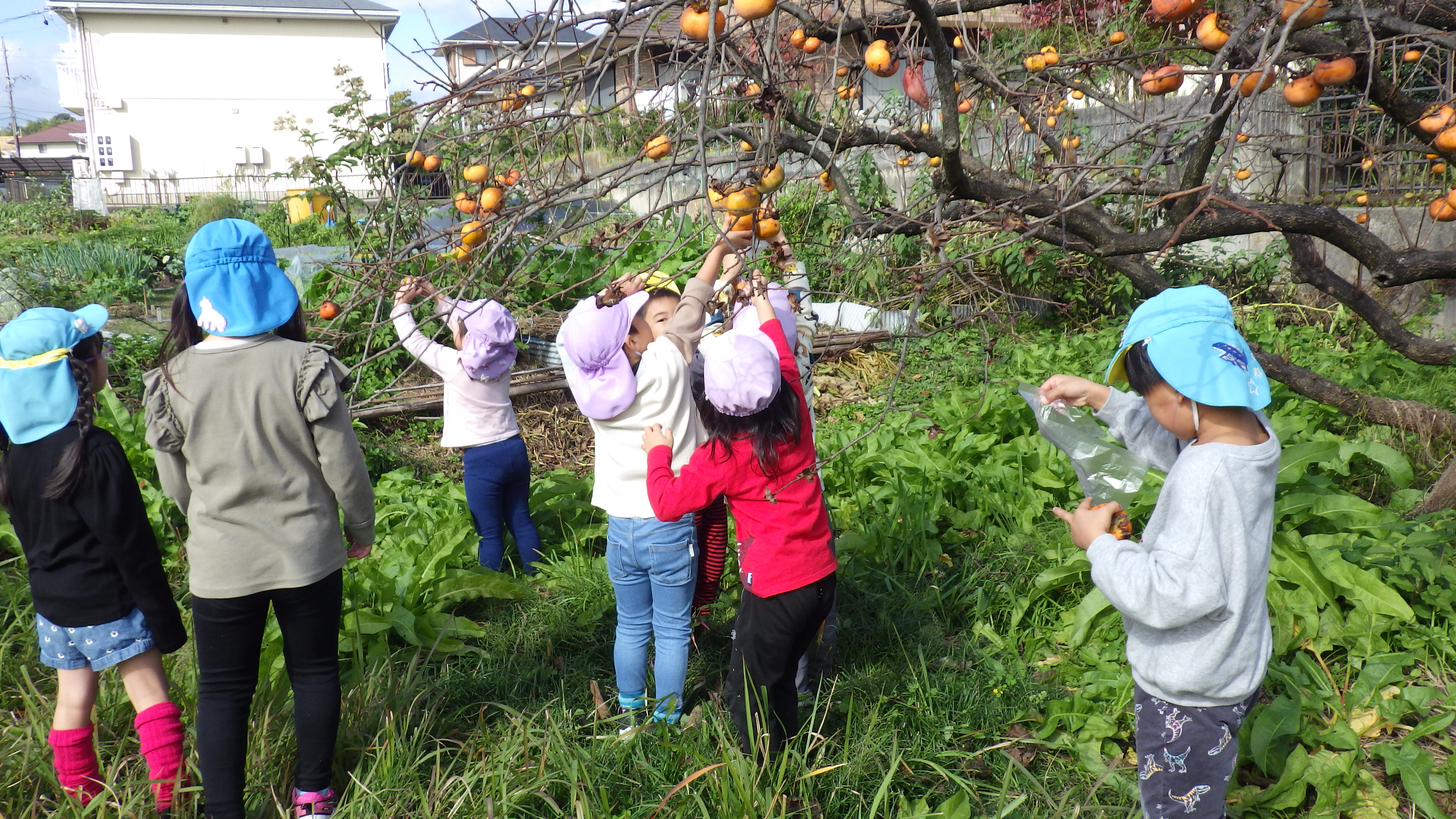 柿の木の前でどの柿にしようか悩んでいる子や、すぐに見つけて取ってしまう子…それぞれ性格が出ていましたよ。なかなか決められない子は友だちと一緒に探したり、枝を持ってもらってその間に柿を取ったりしていましたよ。