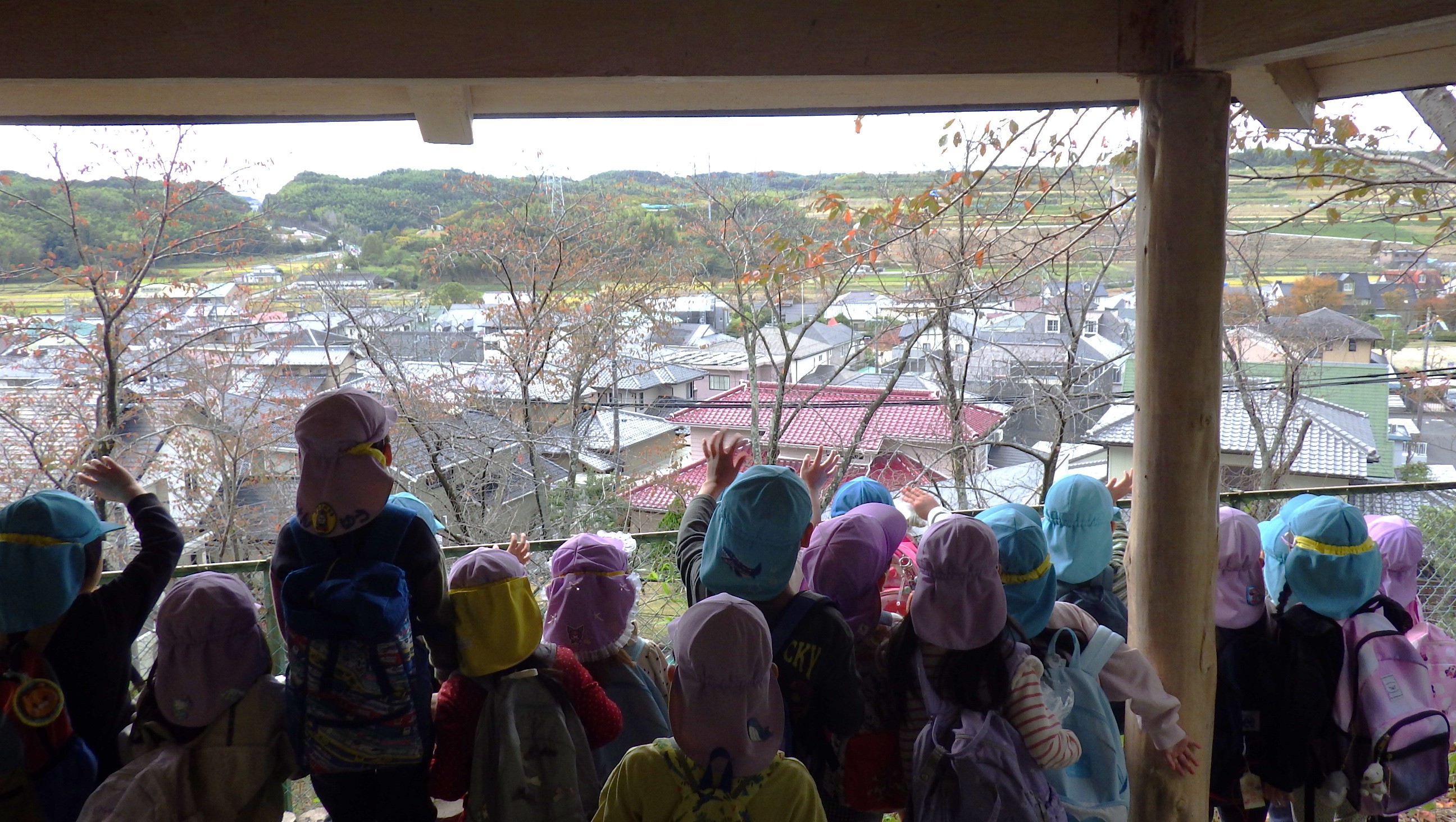 森の中ではドングリを拾ったり、展望台から「おーーーーい!」と叫ぶと保育園の園庭から手を振ってくれるのが見えたり、「おーーーーい!」と反対に叫ぶ声が聞こえてまた叫び返したり…と大はしゃぎでした!(展望台から保育園が見えるのですよ!)