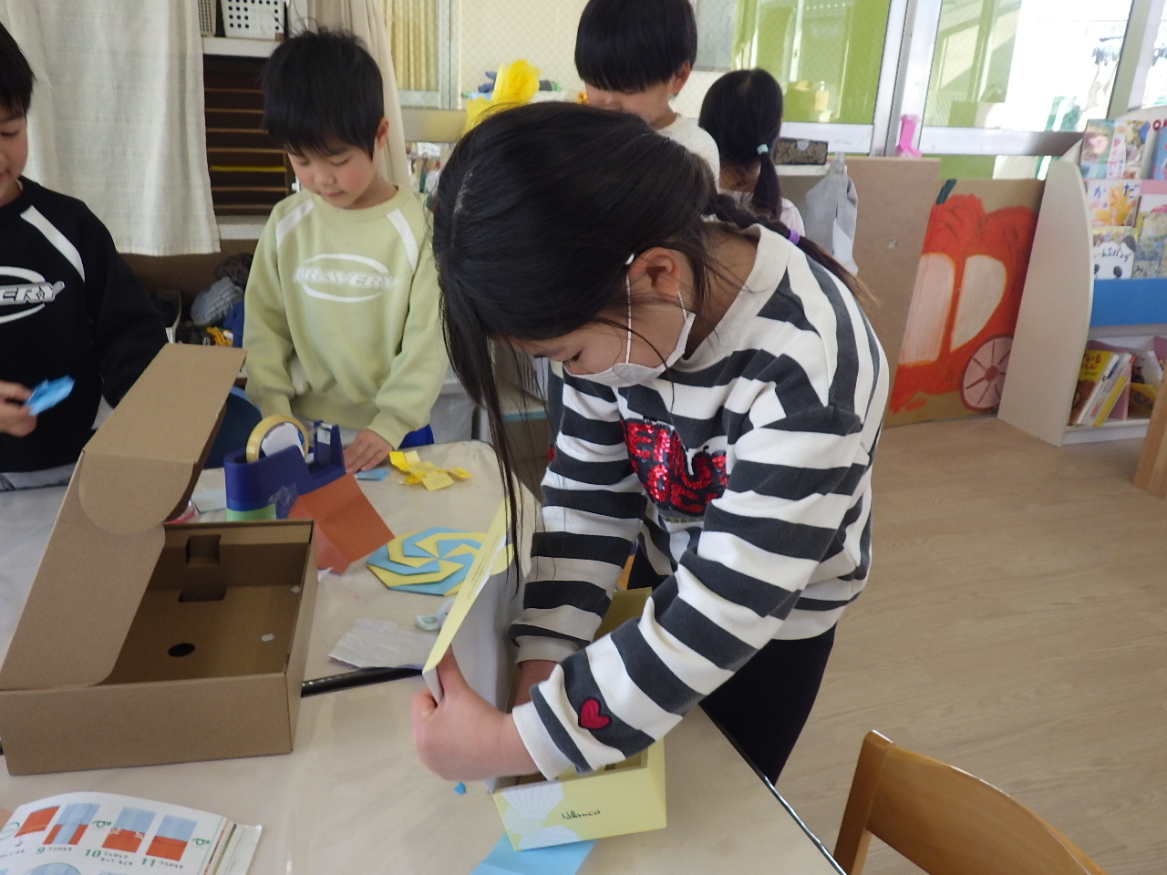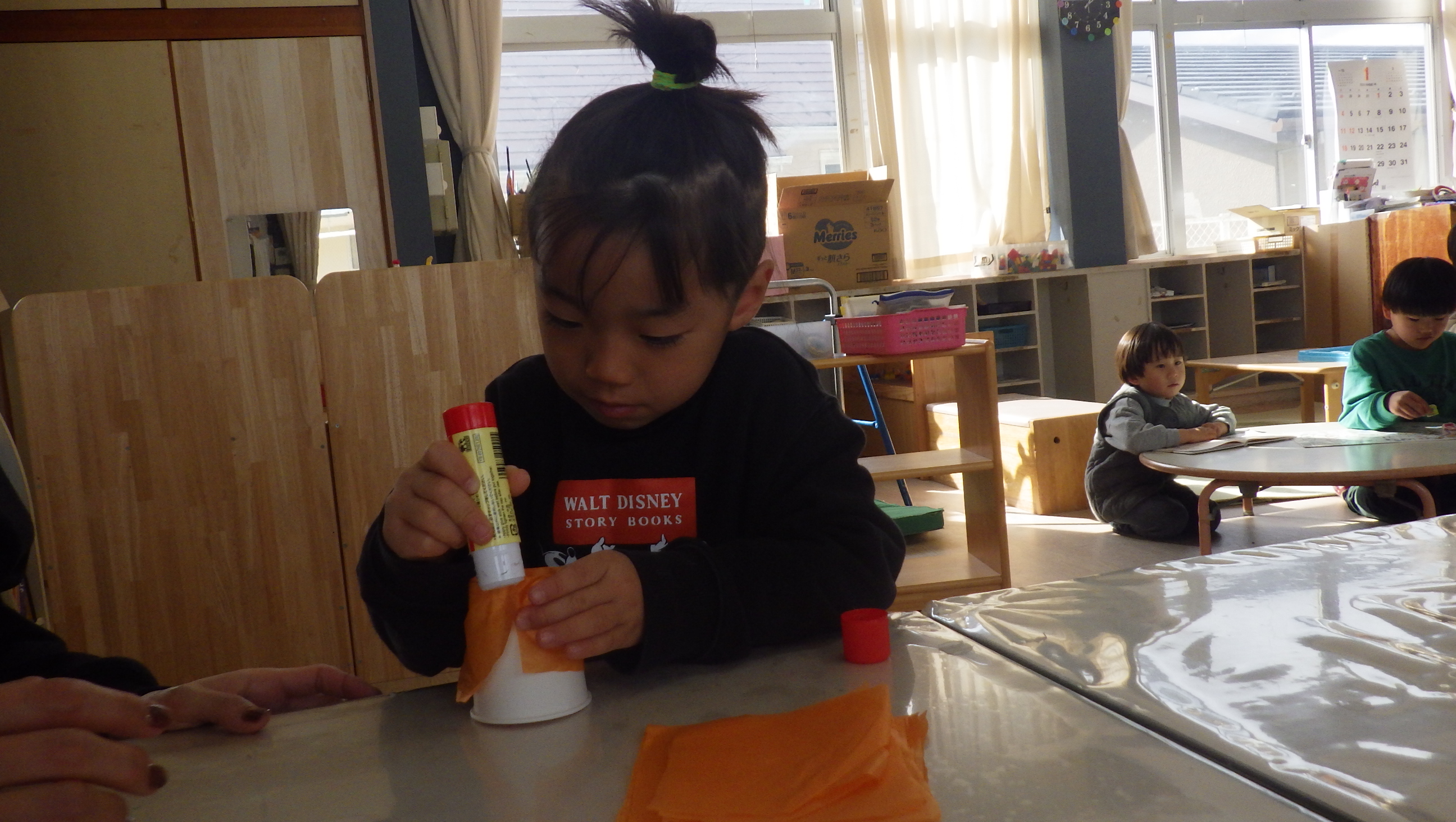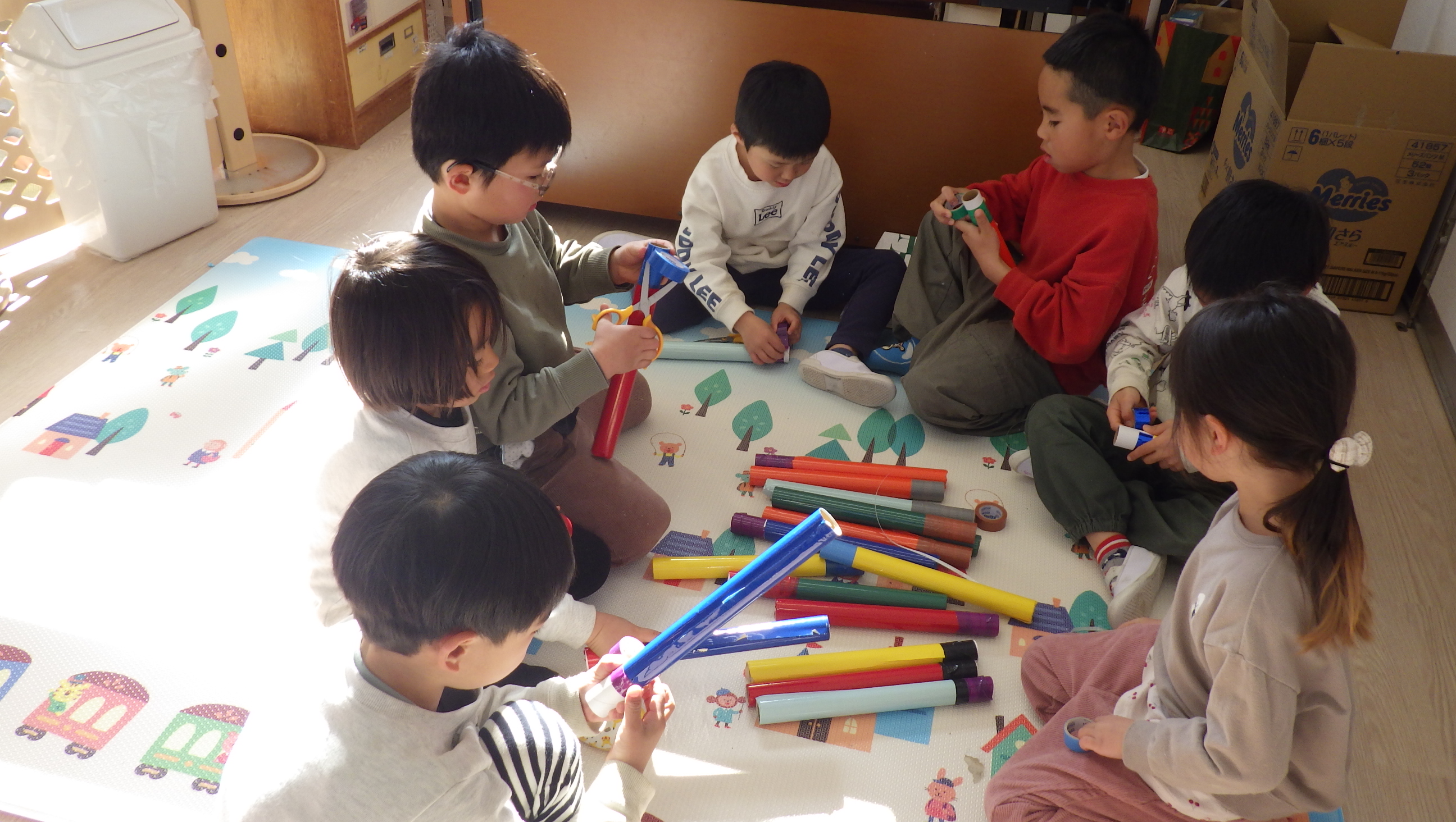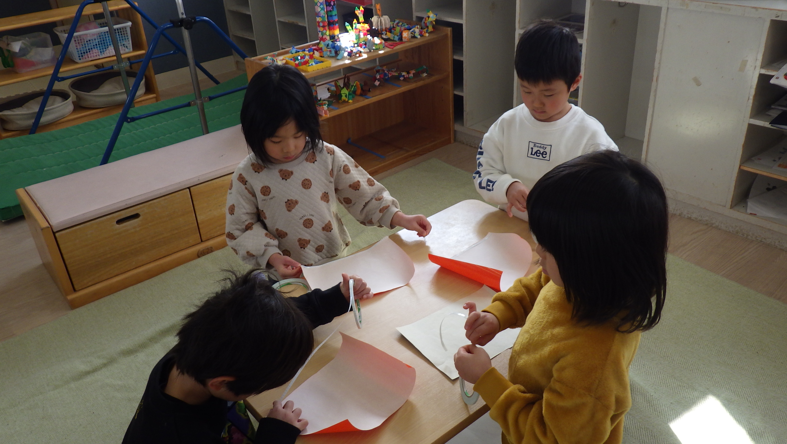 一人がお店屋さんごっこの品物を作り出すと周りの子もやってみたくなるようで、今日は朝から製作コーナーが賑わっていました。出来上がったものを数えて「○個できた!」と教えにきてくれその顔がとっても嬉しそうで「たくさんできてきたね」と返事すると「もう一個作ってくるわ~♪」とさらに張り切って作りにいっていましたよ!頭の中でイメージしたものが形になってきて嬉しいのでしょうね。