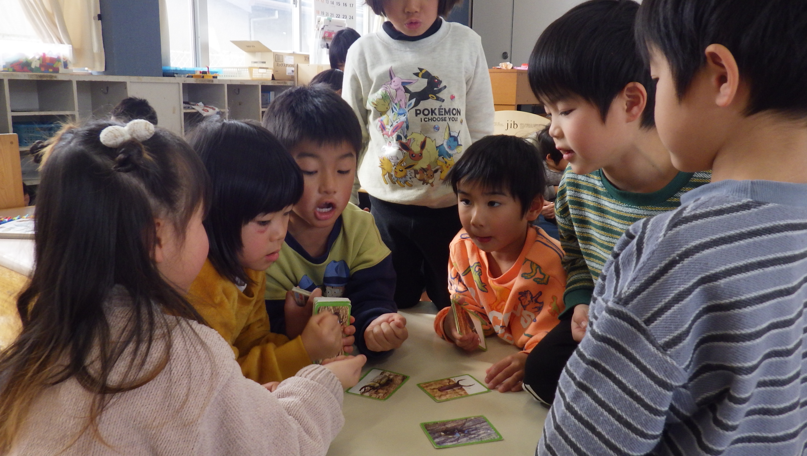 給食後、そらさんが虫カードをしているとにじさんも集まってきて懐かしかったようで一緒にしていました!カタカナばかりの長い昆虫の名前を憶えている子もいてビックリでした!!