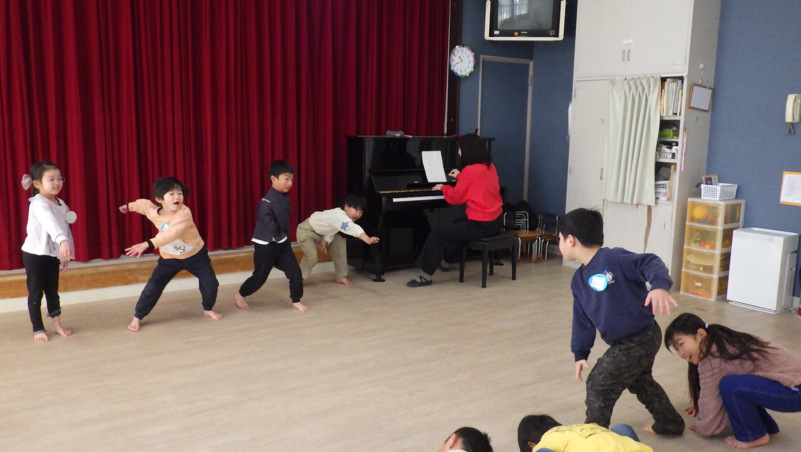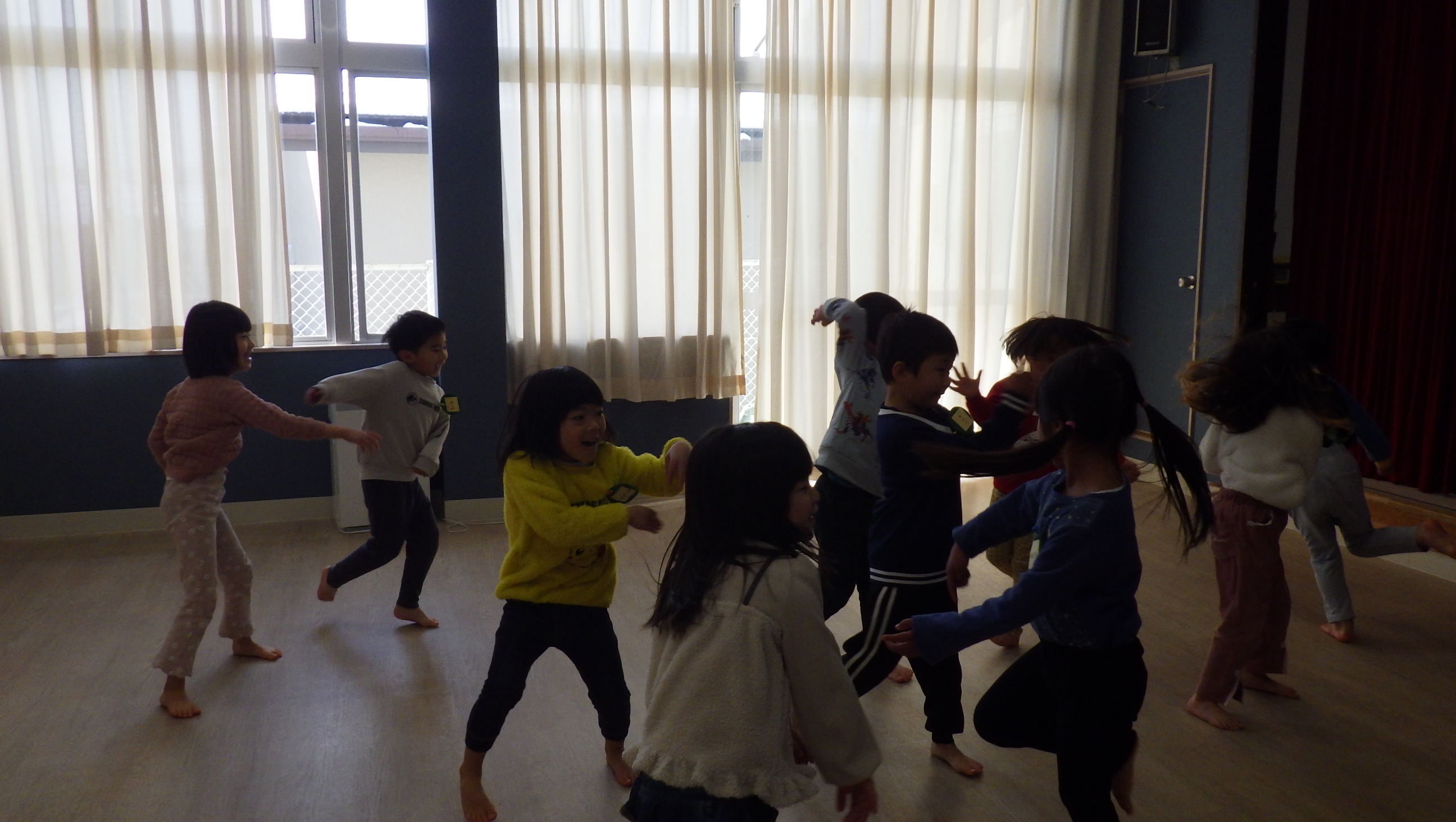 リトミックがありました。リトミックでもピアノの音に合わせて雪玉を作ったり雪を投げて楽しみましたよ♪