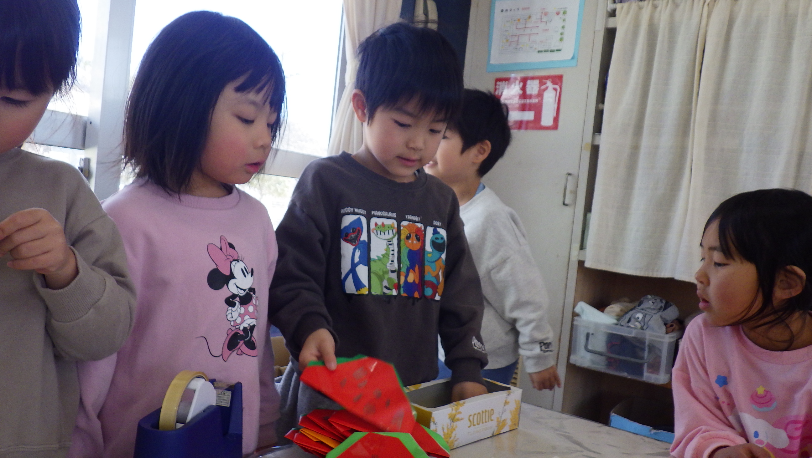 朝の会の時にお店屋さんごっこの進み具合を確認しているのですが、数が足りなくて”作らないと!”と焦る子や、朝の会が終わった瞬間に「お外行ってきまーす!」と元気よく園庭に飛び出していく子…様々です。まだまだ先読みができなくて遊びたい気持ちが勝ってしまうことが多く、なかなか進んでいないのですが大丈夫かなぁ…と心配してしまいます。