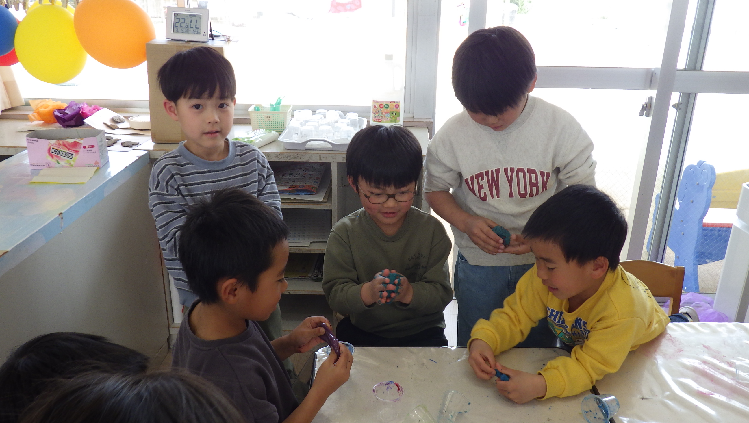 スライムを作るのは慣れているので、好きな色を決めたらカップに入った材料をぐーるぐーる混ぜていました。初めは自分のスライムで遊んでいたのですが、友だちが作った違う色も気になって「交換しよう!」と交換会が始まっていました。色が変わっていくスライムも楽しいようで最後には何とも言えない色のスライムになっていましたよ(笑)