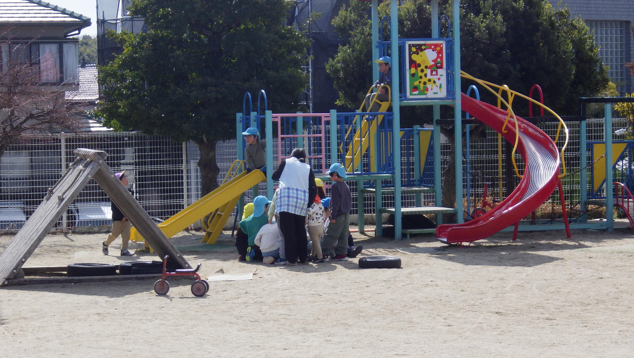 今日は隣の中央公園いきました。ちょうちょを発見すると「いたよー」「こっちきて」とみんなに声をかけるこどもたち。虫かごと虫取り網をもっていっていたのでそれをもって追いかけます。見失うとすぐに「あっちいったー」と指さしをして伝え合い、「もう少し」「おしーい」と口々に言い応援している子もいました。捕まえると「やったー」とみんなで大喜びでした。でもすぐににげてしまい、3回ほどその繰り返しでしたよ。「みせてみせて」とみんなで捕まえたちょうちょを見つめるこどもたちでした。今日は最後の合同保育でした。3歳児さんは憧れの目で見つめ、自分でもしてみようと意欲が育ち制作や遊びが発展してきました。4歳児さんはお姉さん・お兄さんという思いでやってあげたり教えてあげたりする姿が多く一緒に遊び3歳児さんとの交流が増えました。充実した2週間でした。来年度が楽しみです。