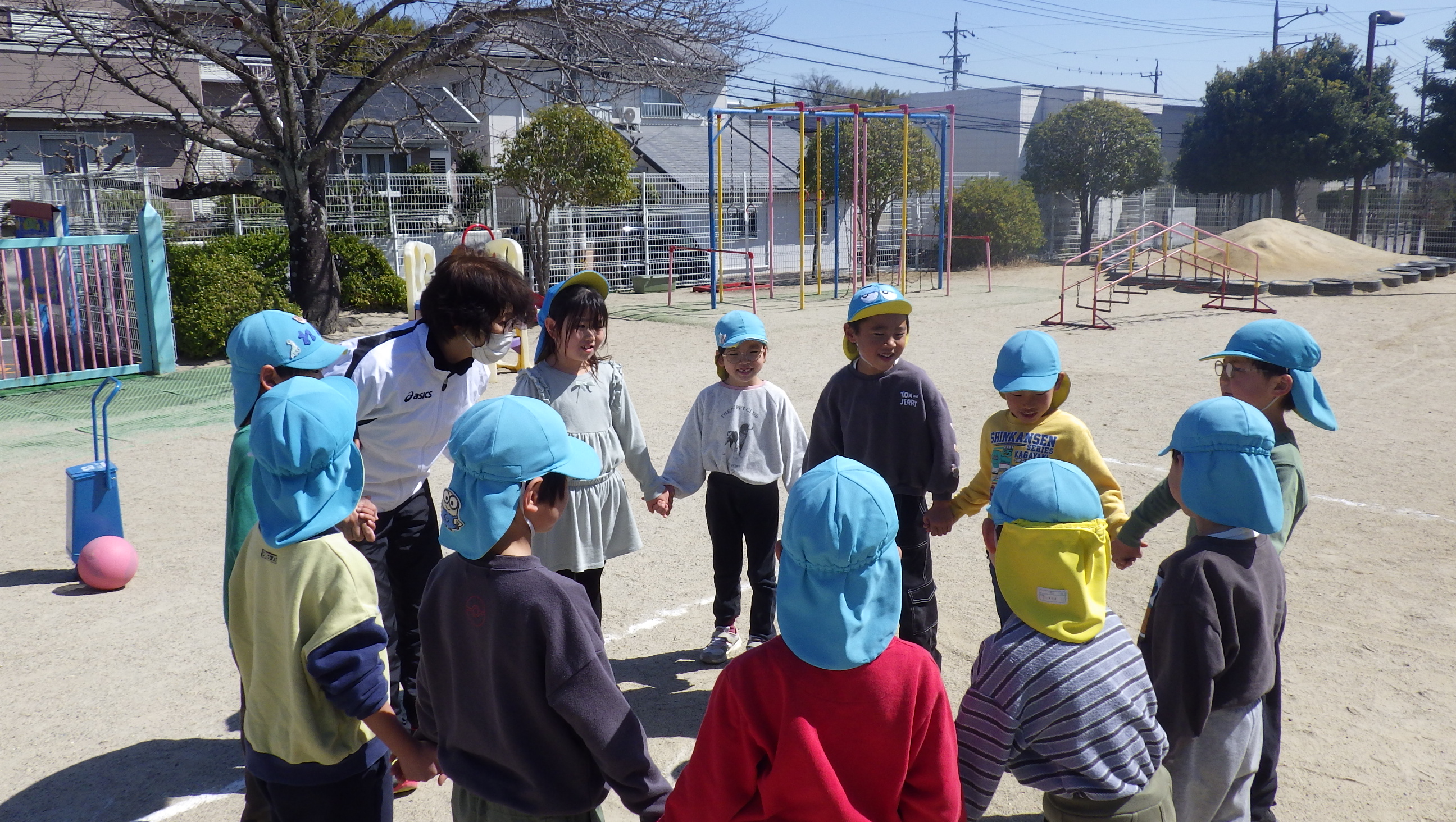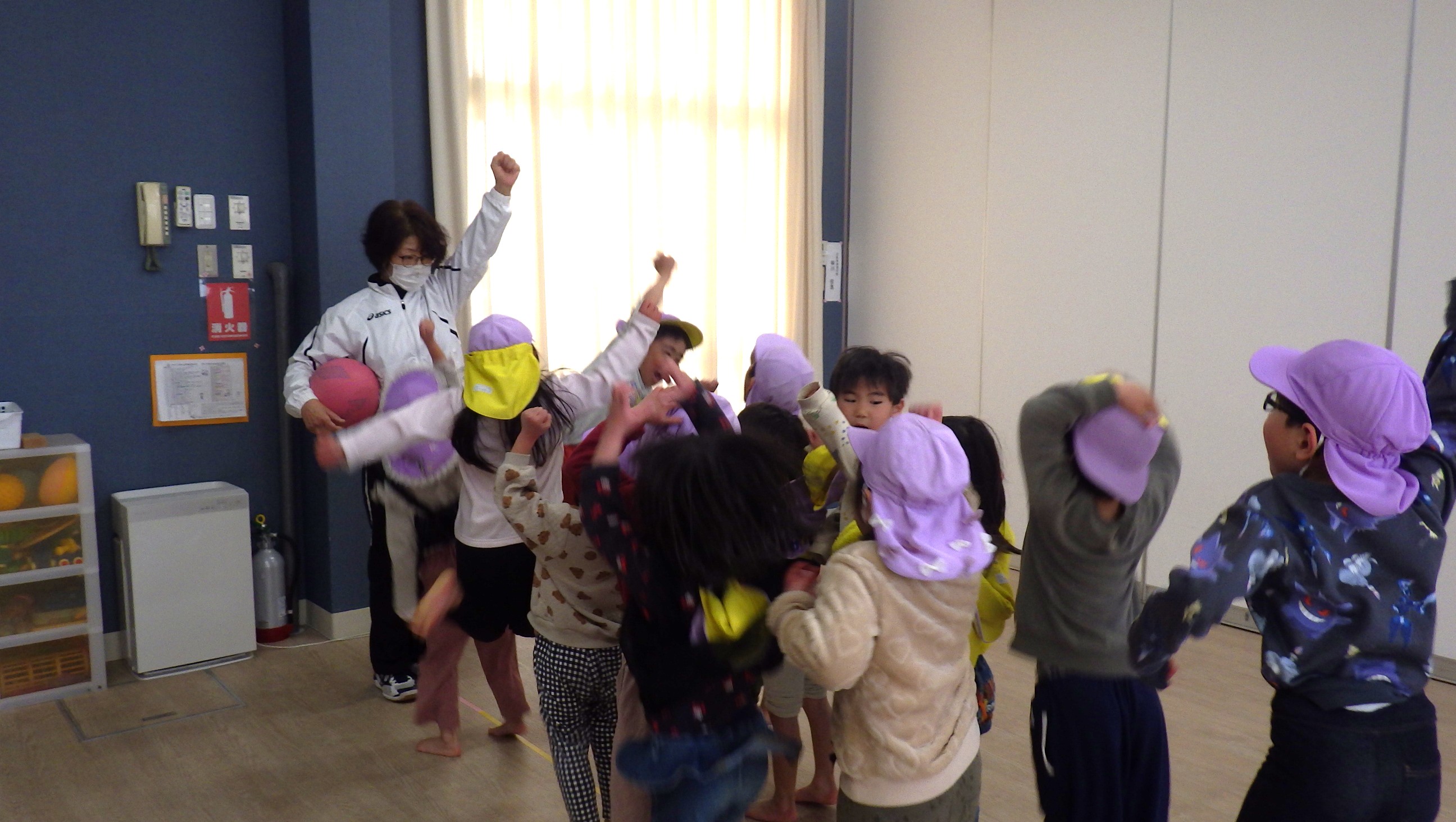 今年度最後の体育教室がありました。年中さんはジャンプや鉄棒などで体を動かした後ドッジボールを、年長さんは園庭でドッジボールをしました!