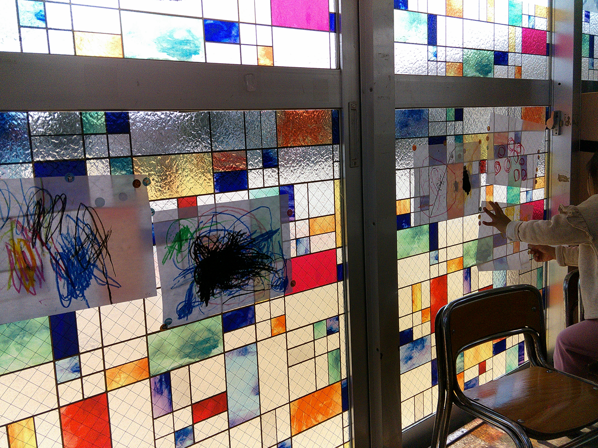 そして今日は午前のおやつ前にお絵描きが始まります。少しずつ丸も上手になってきて似顔絵を描いたり、手まで描けるようにもなっていたりしてみんなの成長に驚かされました!また、紙の周りに自分たちでシールを貼って部屋の窓に飾っている子もいましたよ。また、送迎時にでもぜひ見てあげてください♪