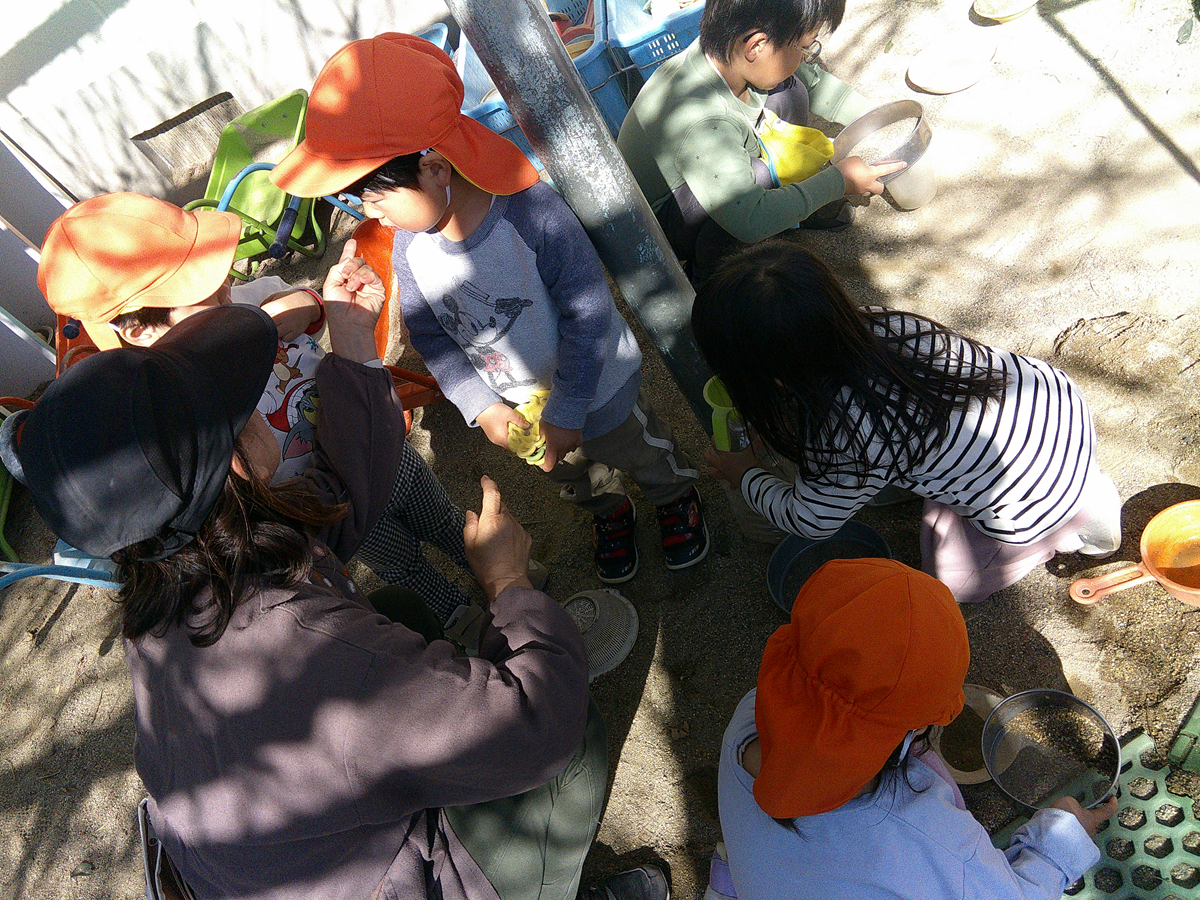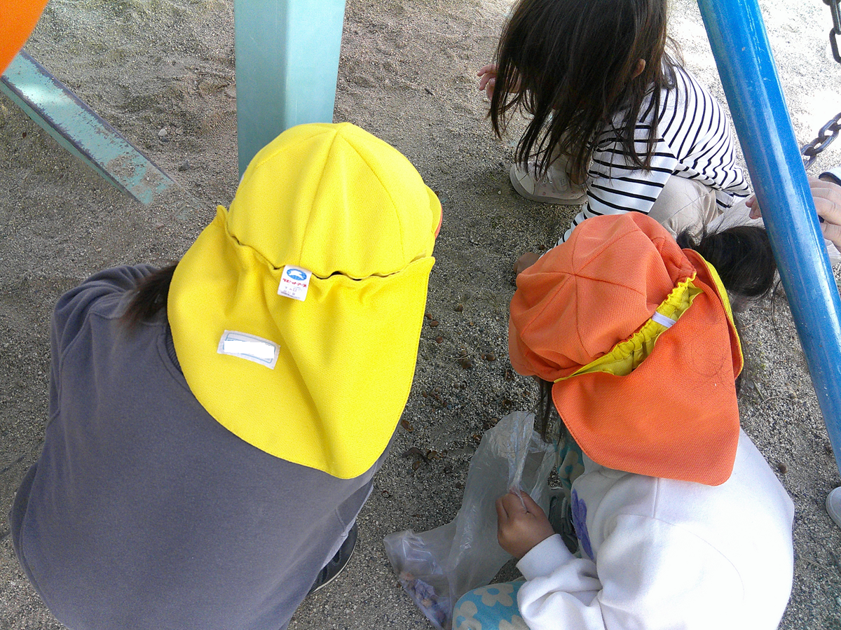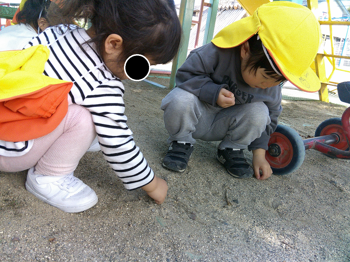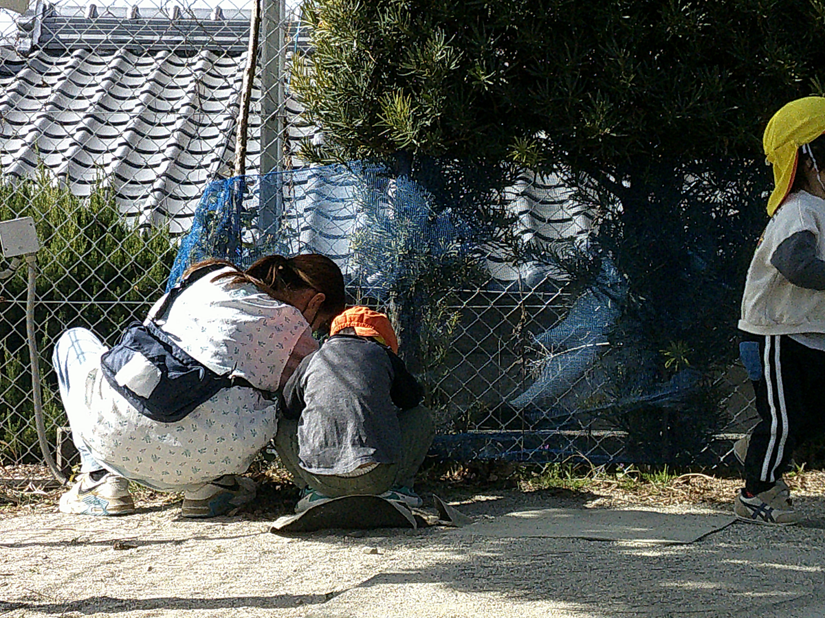 時々、どんぐりの皮がめくれているのがあり気になりじっくりと観察するこどもたち。「なんで」こうなっとんの?」と疑問を口にし、「あ!誰かが食べたんかな?」「お腹空いてる虫さんじゃない?」と想像を膨らませていました。可愛いこどもたちのやり取りでしたよ♡
