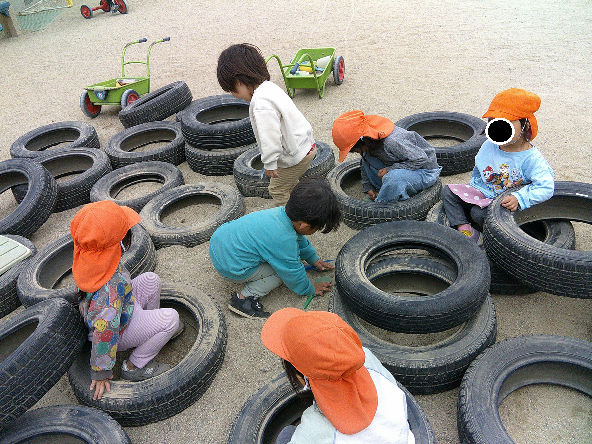 園庭のタイヤをお風呂に見立てて楽しむこどもたち。恐るおそるタイヤに入って座って「ちょっと!熱いわ!」と言ったり「ポカポカする~!」と満足気だったり。砂をスコップで混ぜて熱いお風呂を冷ましたり、砂をたくさんタイヤの中に入れて泡風呂のようにしたり…。体があたたまった後には元気に滑り台を滑るなどして楽しみました。想像力豊かなこどもたちの姿に日々驚かされます。