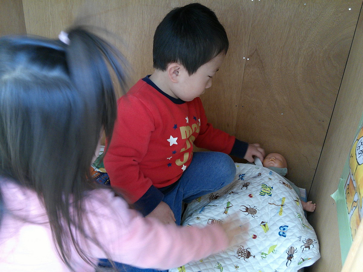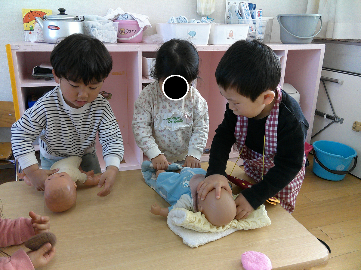 「大丈夫?どこが痛いですか?」「すぐに治るから待ってね」と赤ちゃん人形に声を掛けて傷の手当てをしたり、布団を枕にしてそっと寝かせてあげたりしていました。