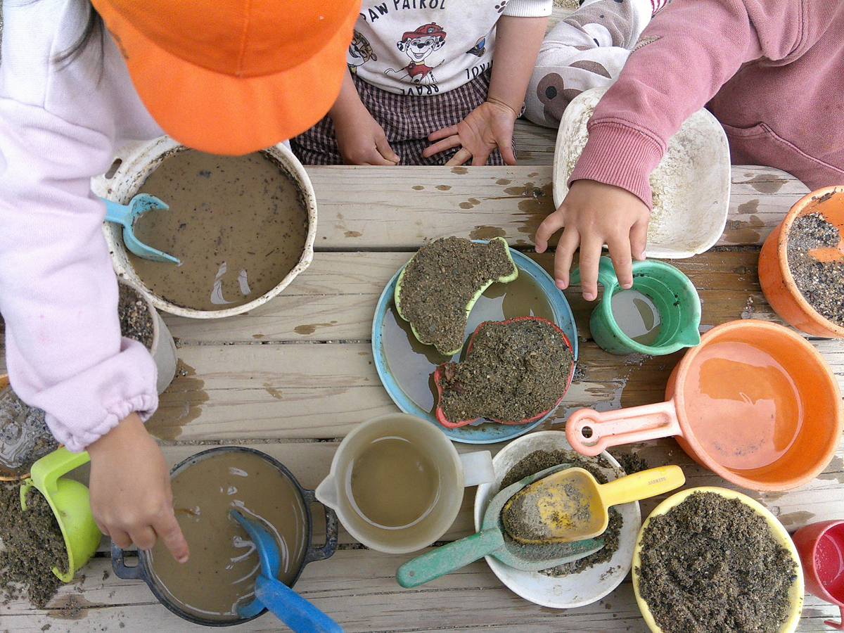今日は園庭に出ると、ご馳走作りが始まります。泥水を味噌汁に見立てると、「ネギがいるね!」と近くの葉っぱを拾ってきてネギに見立てていました。パラパラと細かくちぎって泥水の中に浮かべて美味しそうな味噌汁を作っていましたよ。