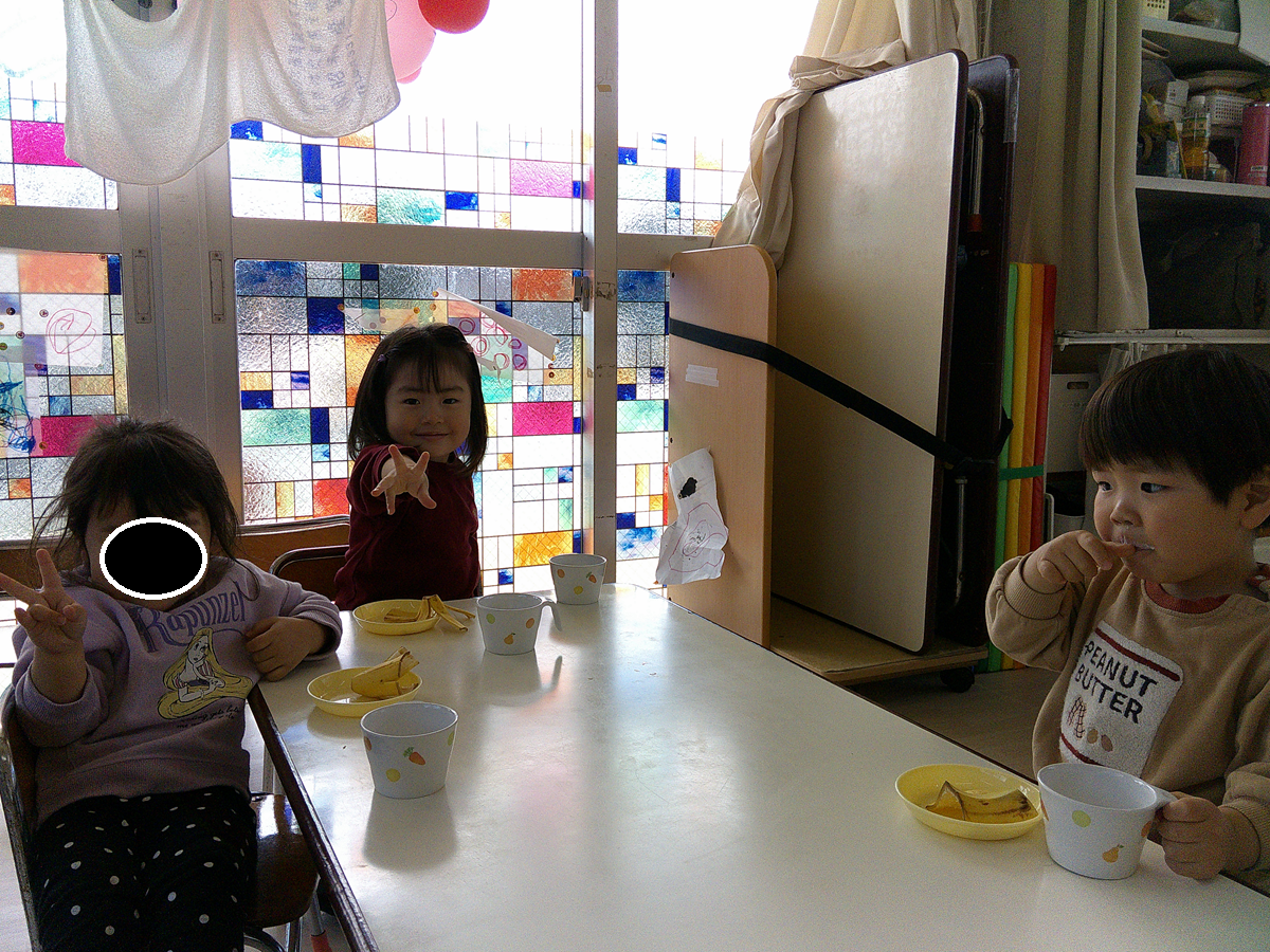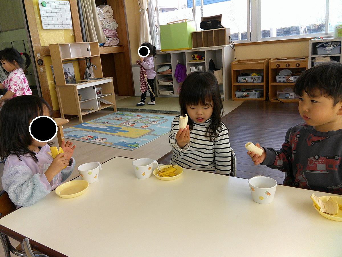 おやつだよと保育士に伝えていると、「今日のバナナは甘いの?」「すっぱかったらどうしよう」と話をしながら準備を始めるこどもたち。手を洗いに行くと、自ら友だちを誘い合って椅子を運んで来て楽しそうに食べていました。