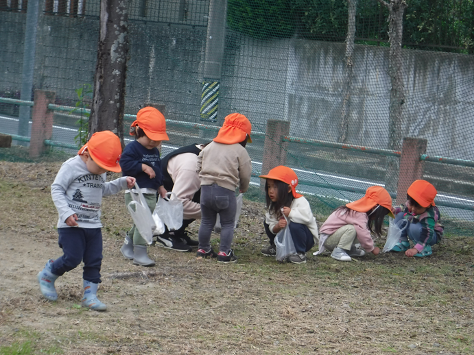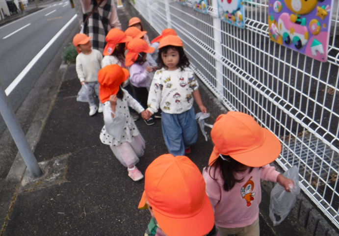 友だちと手を繋いで歩いている道中には、大きな木の実がなっている場所があり、見つけた子どもたちが「あれみて!」「食べちゃお♫」と食べる真似をして歩きながら遊ぶ子ども達でした。