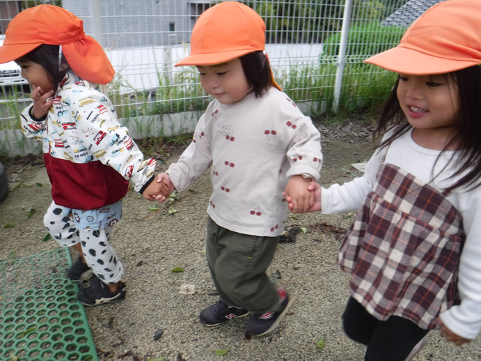 最近、友だちと一緒に手を繋ぐことが楽しい様子のりすぐみさん。そのため、先日隣の公園まで歩いて散歩に出かけました。自ら一緒に繋ぐ友だちを探しに行き、一生懸命自分たちで歩く姿に成長を感じました。
