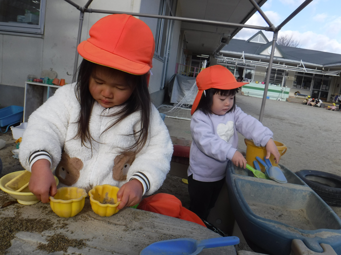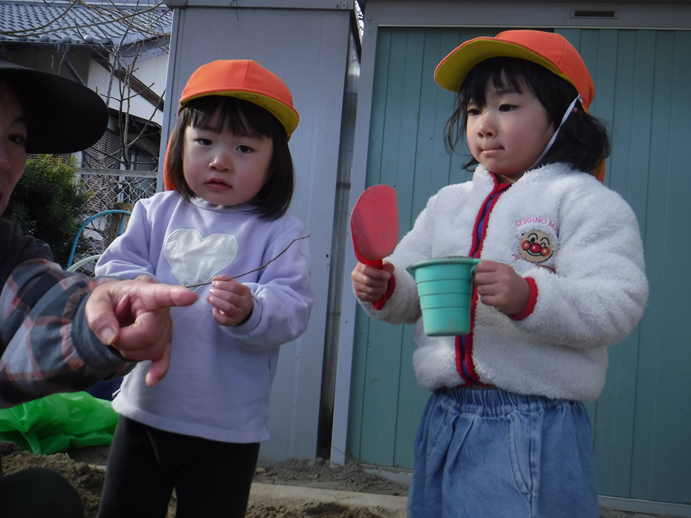 「たこやき作るね!」「カレー作るね!」とご飯を作り始めると、「僕・私はケーキとプリン作るね!」などと、きちんとデザートまで用意を始めるのです。また、周りの友だちがご馳走を作っているのを見て、「買い物行ってくるわ~」と手押し車を押して出かけ、砂場へと皿やコップを買いに行ってくれる子もいましたよ。自然と遊びの中でこどもたち同士で役割を分担していく姿に遊びが広がってきたなと嬉しく思いました。「たんたん…誕生日♪」と歌も歌い、楽しみましたよ。