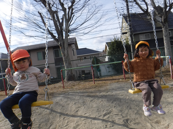 今日も隣の公園まで歩いて散歩に出かけました。着くまでの約束をこどもたちと出発の前に確認をしていると、「ぎゅっと手を繋ぐ!」「車が来て危ないから!」と昨日の話をきちんと覚えて応える姿に驚きました!