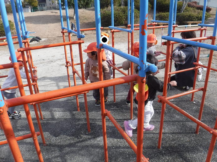 公園に着くと、ジャングルジムでは「僕たちどこでしょうか」と待てまて遊びやかくれんぼをしたり、ブランコに乗って楽しんでいましたよ。「1、2,3…10。おまけのおまけの汽車ポッポー。ポーッとなったら変わりましょポッポー変わって!」と順番を守って楽しめるようにもなってきて成長を感じましたよ。