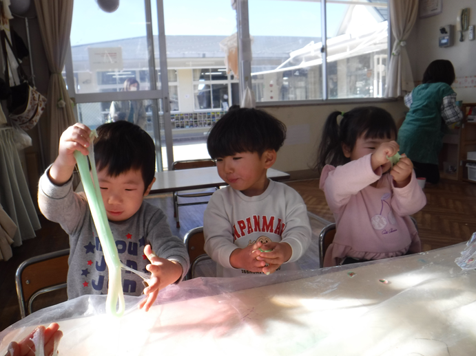 久しぶりにスライムを用意しました。「べちゃべちゃする~!」と言いながら伸ばしたり丸めたりして感触を楽しんでいましたよ。手に付くと何度もきれいに手を洗いに行くこどもたちでした。