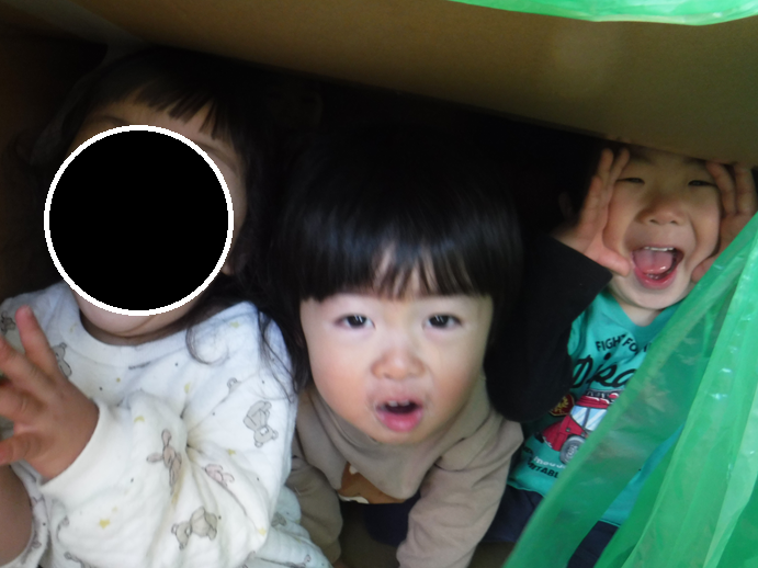 そして、部屋に大きな段ボールを持ってくると大興奮のこどもたち。スズランテープを付けるとそこから顔を覗かせて「ぎゃ~!」とびっくりし合うのを何度も繰り返し楽しんでいました。段ボールの中に入ると暗いのに気付き、「懐中電灯いるよね!」「電気で明るくしないとね」と、ままごとコーナーからコップを持ってきて懐中電灯に見立てていましたよ。身近にある物で見立て遊びも楽しめるようになってきました♪