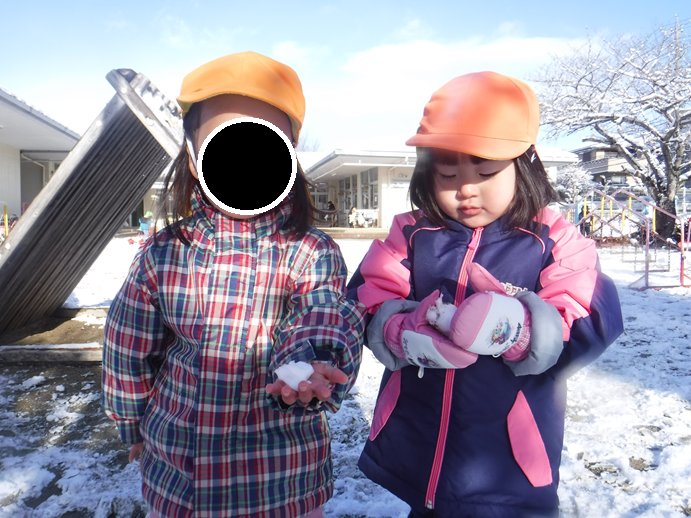 朝から、「雪だ~!早くしないと無くなっちゃう!」と慌てて園庭へと出かけていくのですが「寒いから手が痛い…」とすぐに部屋へと帰ってくるこどもたちでした。寒い感覚などが分かってきて自分で判断して部屋へと戻ってくる姿に驚きました!