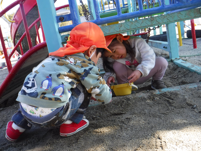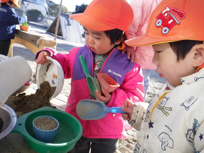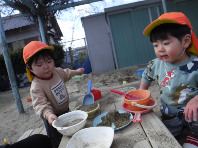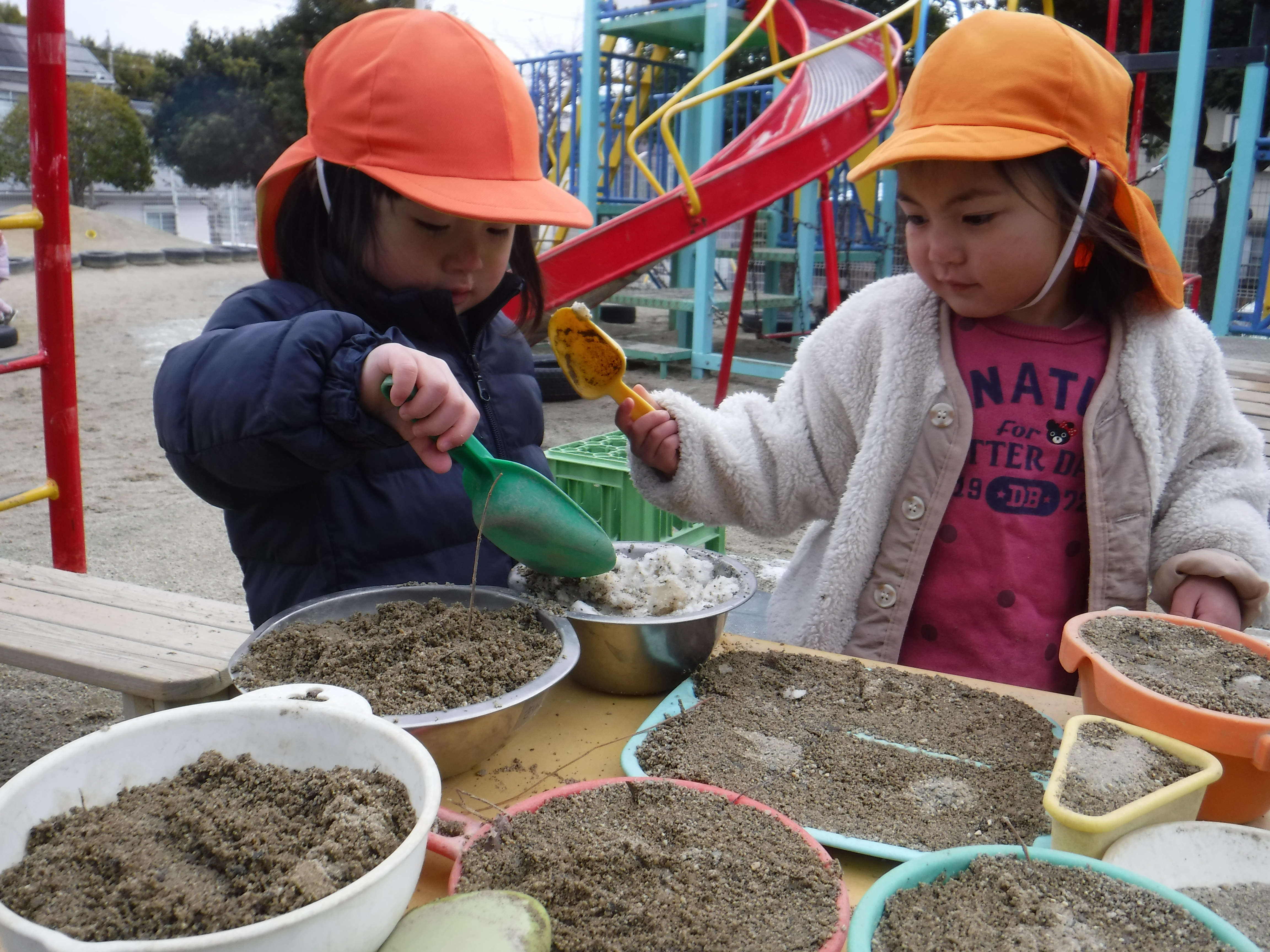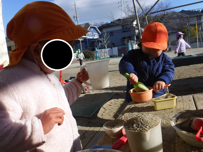 友だちと同じ空間が楽しくなってきたりすぐみさん。こどもたち同士で誘い合って、それぞれに好きな遊びを楽しみますよ。園庭の砂場に行くと、「いらっしゃいませ~」とご馳走を作って振舞ってくれます。「お腹いっぱい?デザートもあるよ」と得意気に作るこどもたちでした。