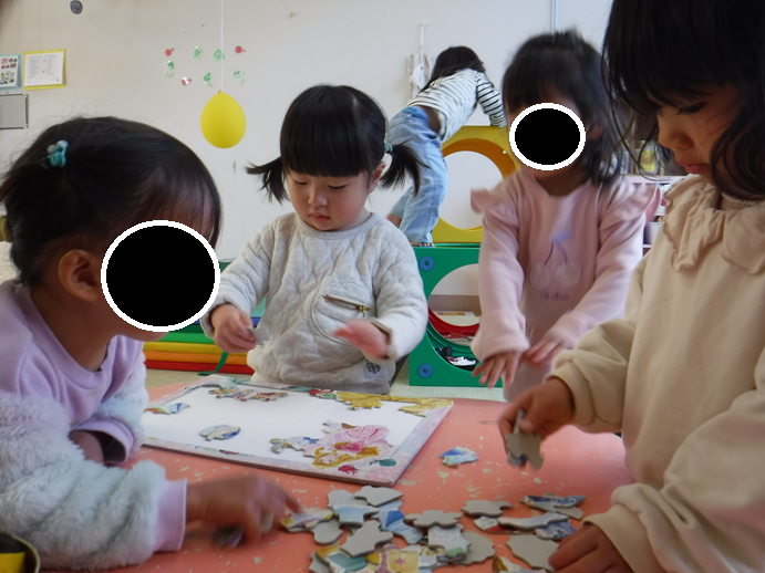 また、ピースの多いパズルにも夢中で取り組みます。少しずつやり方も分かってきたようで同じような色のパズルを先に揃えておく姿なども出てきましたよ。