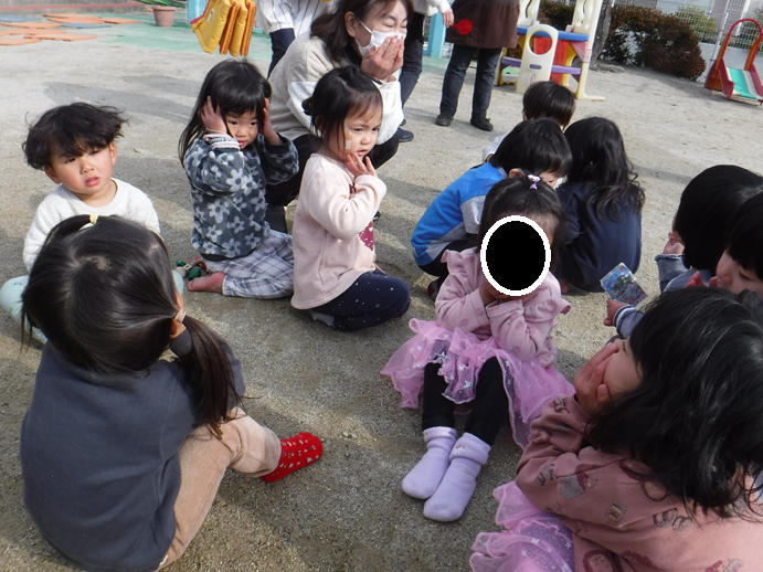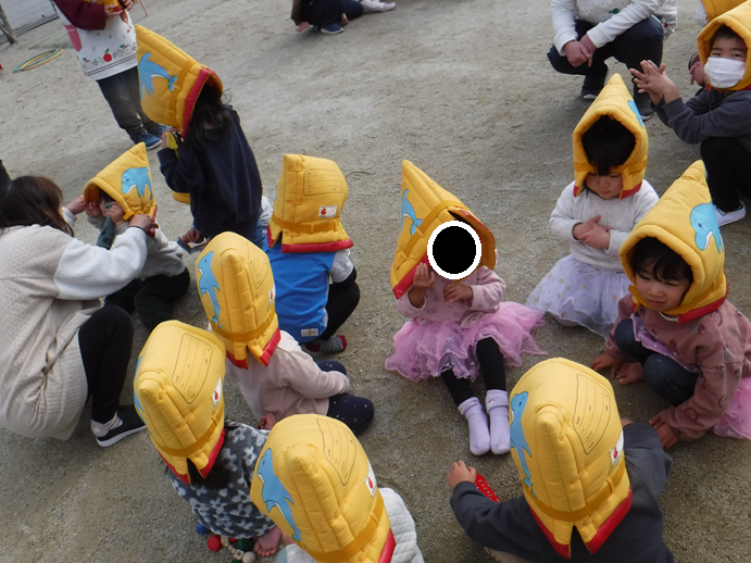 園庭へと避難すると、周りのお兄ちゃんたちを見て、同じように口を隠す姿も見られましたよ。