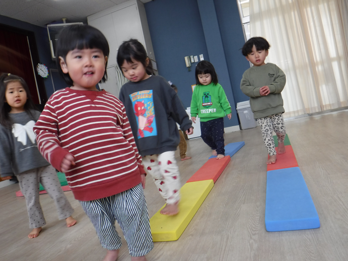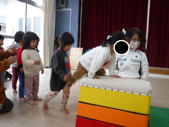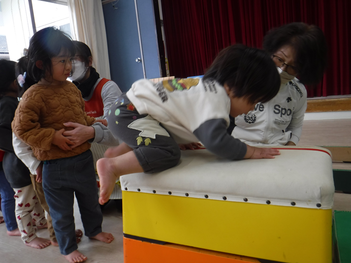 跳び箱の上に登ってジャンプをしたり斜面の登り降りをしたり…。足腰を使って上手にすらすらと登っていく姿に驚きました。とても楽しかったようで、「もっとやりたかった~…」『体育教室、頑張ったよってママとパパに言っとく!」と話していました。またお家でどんなことをしたのか、ぜひ聞いてあげてください。