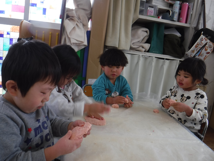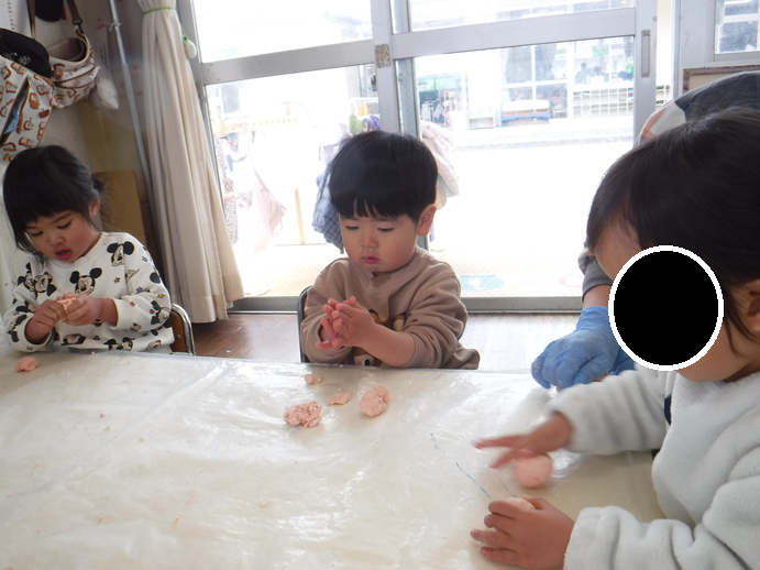 いざ自分の手元にくると、「きもちいい~!」と感触を味わい、「色が桃みたい」などと話をしたりして、いろんな形を作って楽しんでいましたよ。繰り返しこねていると、柔らかくなってくることにも気づいたようで変化を楽しむ子の姿も見られましたよ。