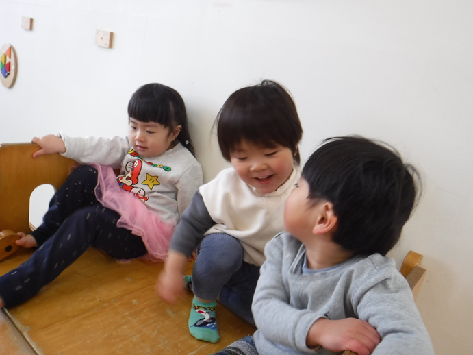 今日は、朝から雪で寒かったですね。こどもたちも自然と室内で過ごし、それぞれに好きな遊びを楽しんでいましたよ。ちょうちょう組に行って滑り台の斜面を登り降りしたり、何度も繰り返して滑ったり…。その中で、場所の取り合いで言い合う姿もありましたが保育士が仲裁に入ることで、「変わって!どいて!」と自分なりの言葉で相手に思いを伝えられていましたよ。