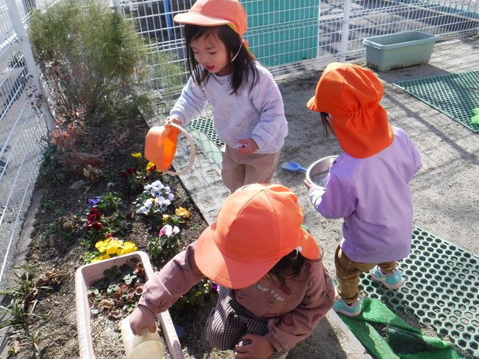 また、足洗い場の水道の水を出していたので声を掛けると、「お花に水をあげたいの」と言って何度も繰り返し花壇のお花に水をあげていましたよ。