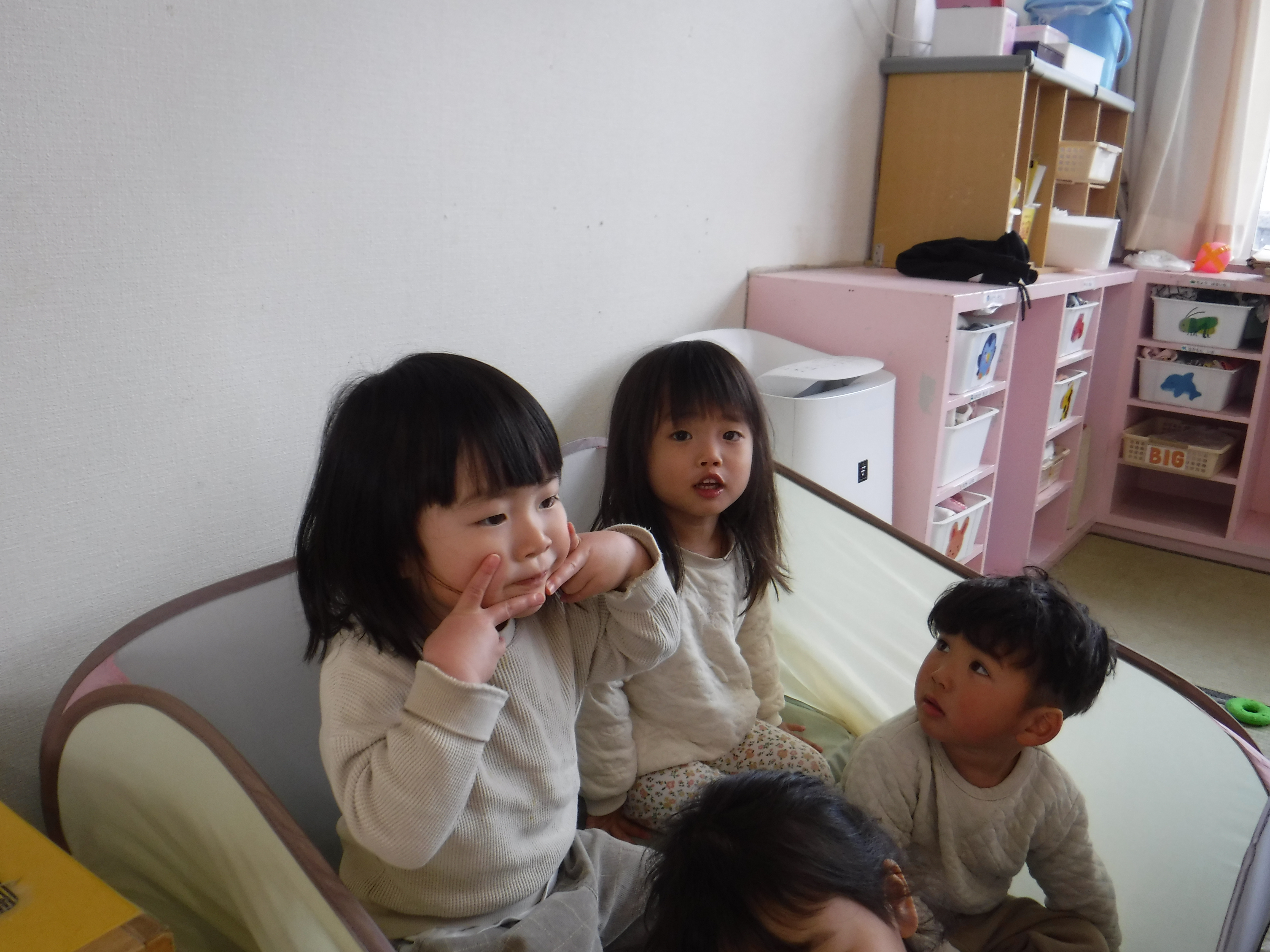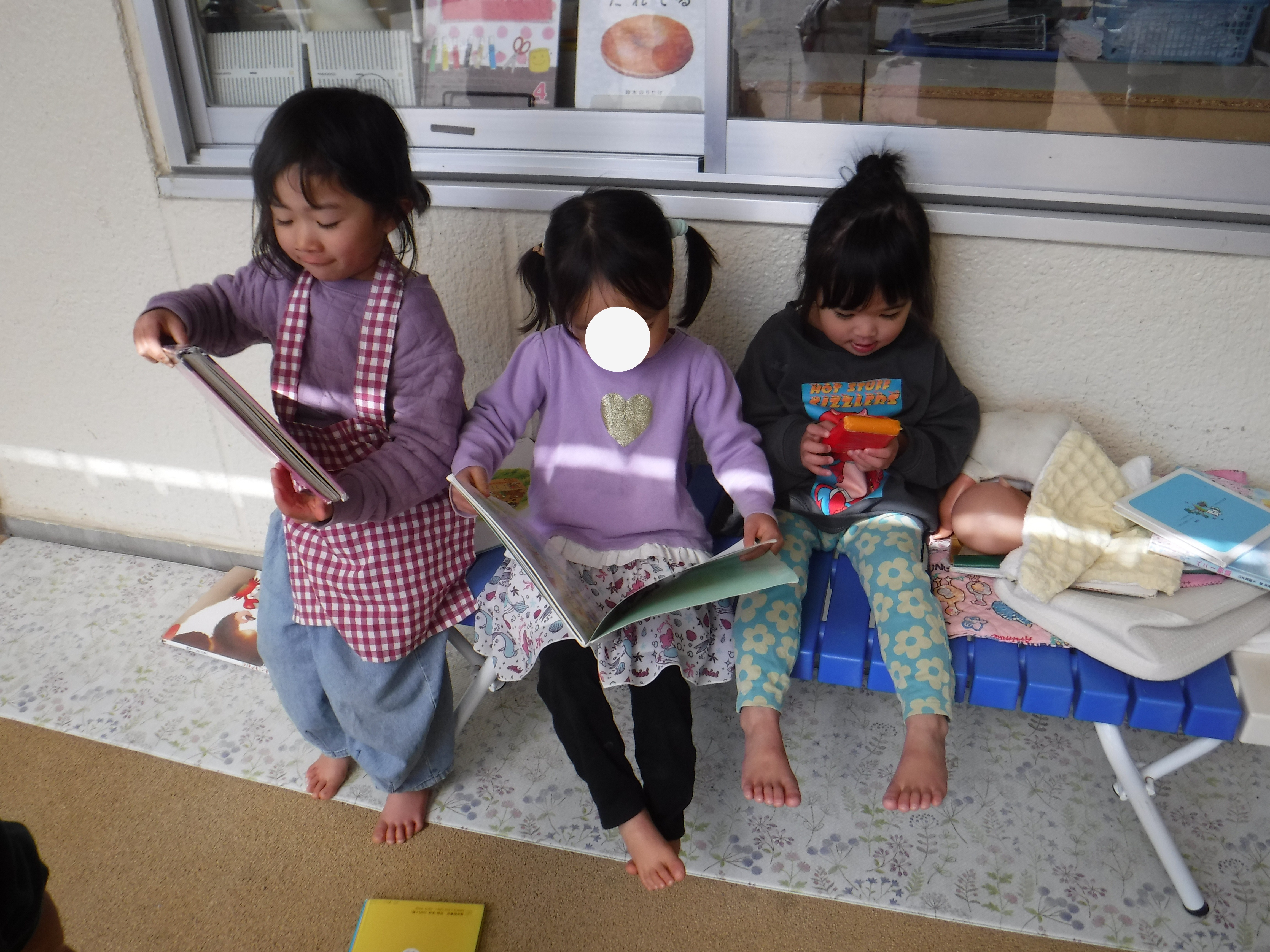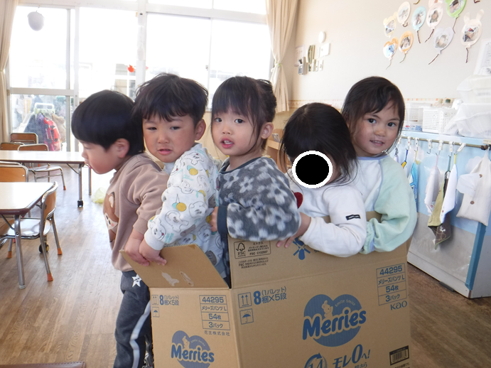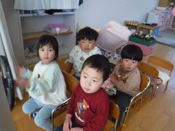朝から椅子をバスに見立て、バスごっこが始まります。「どこ行きますか?」と尋ね順番に行先を決めてそこまで向かうと、一人ずつ降りて行くのです。本当のバスのように見立てて遊ぶ姿が面白っかったですよ。自然とこどもたち何人かで楽しむ場面が多くなってきて成長を感じます♪