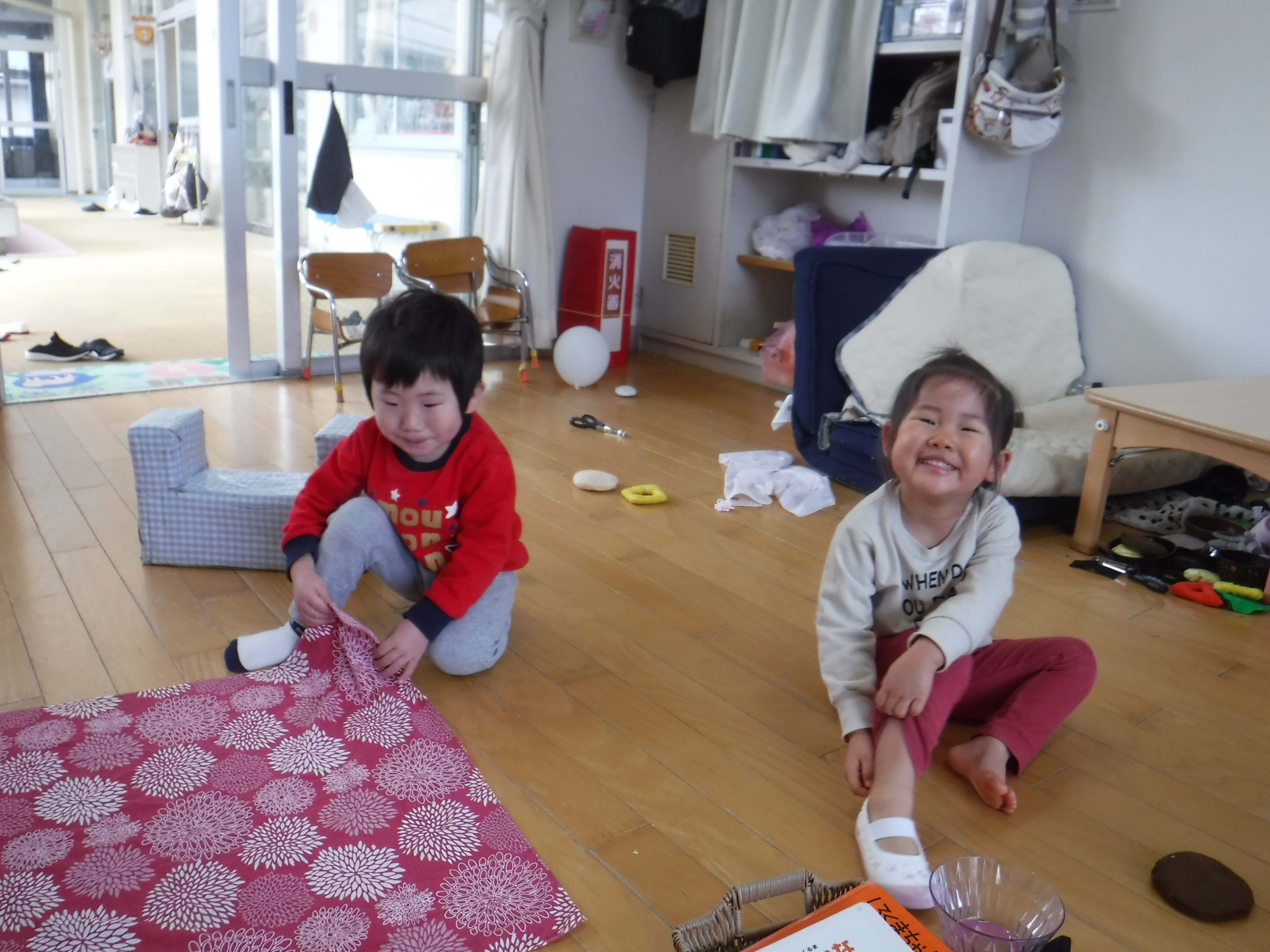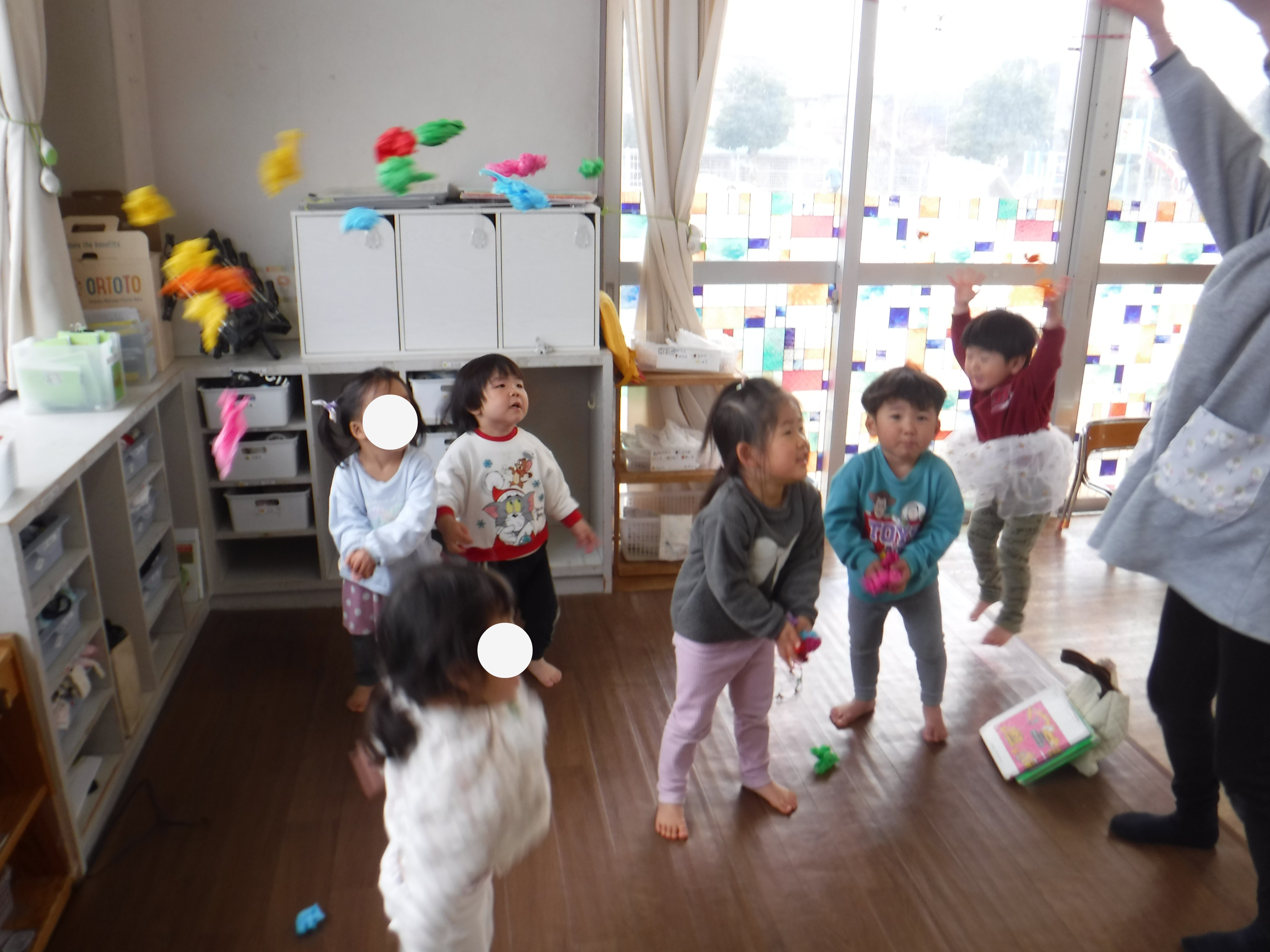 ごっこ遊びで朝から盛り上がるりすぐみさん。ままごとをしているのかと思ったら玩具をポイポイ投げだしたので「何してるの?」と尋ねると、「花火なの」と言うので、お花紙でやろうよ!と誘うと色々な色の紙を選んでグチャッと丸めてポイ!「あ、花火だ~!」と大喜び♡