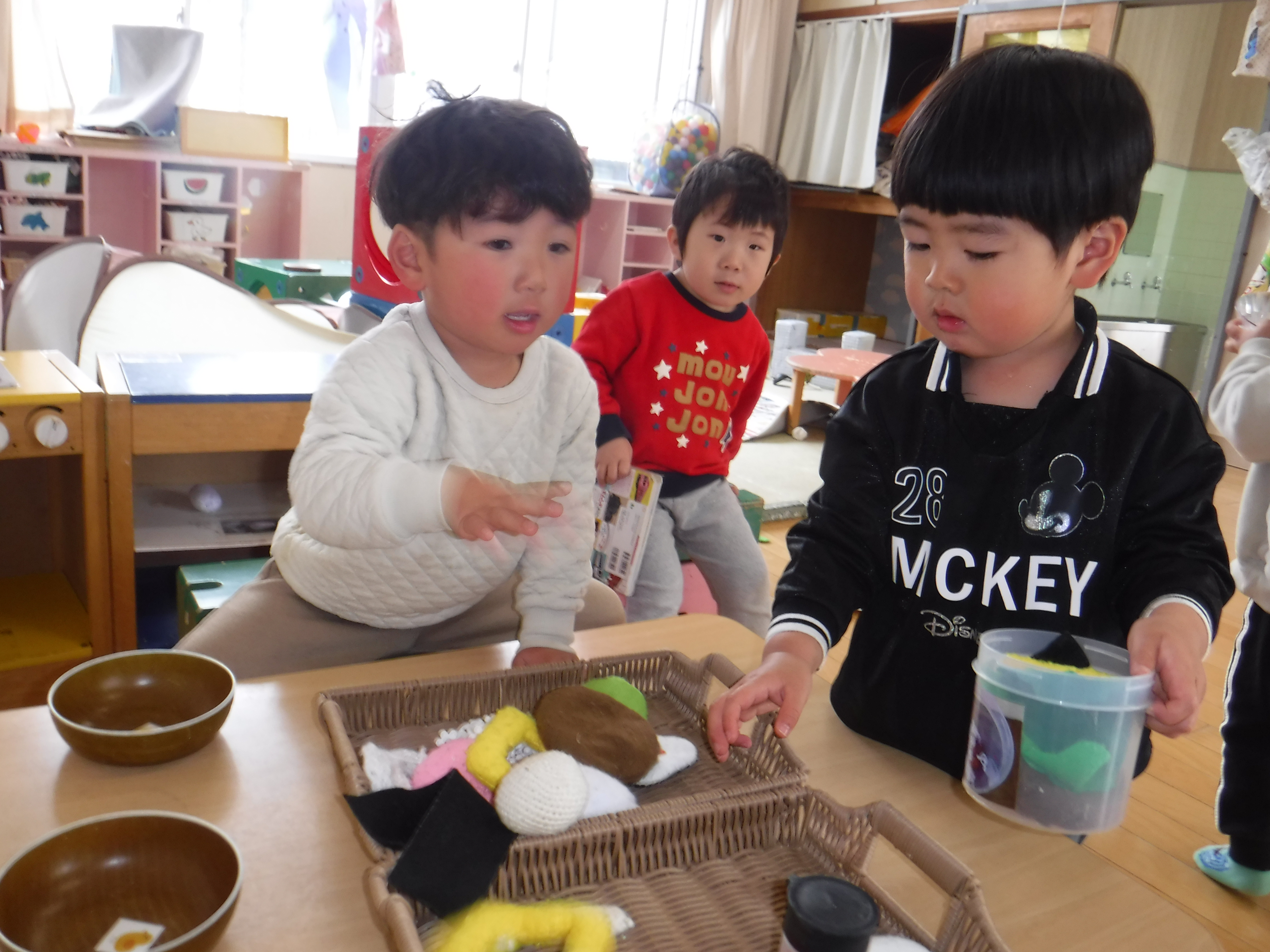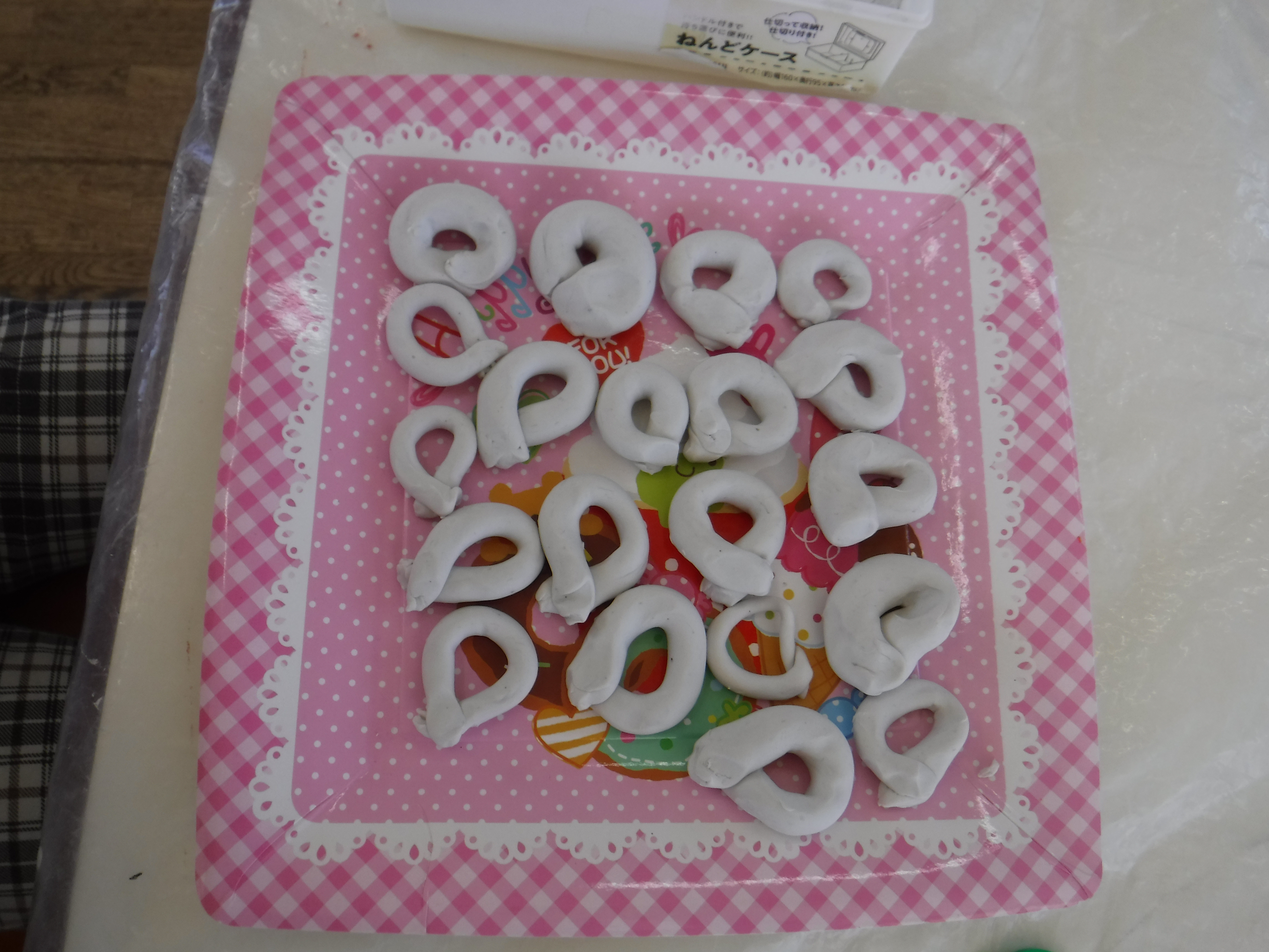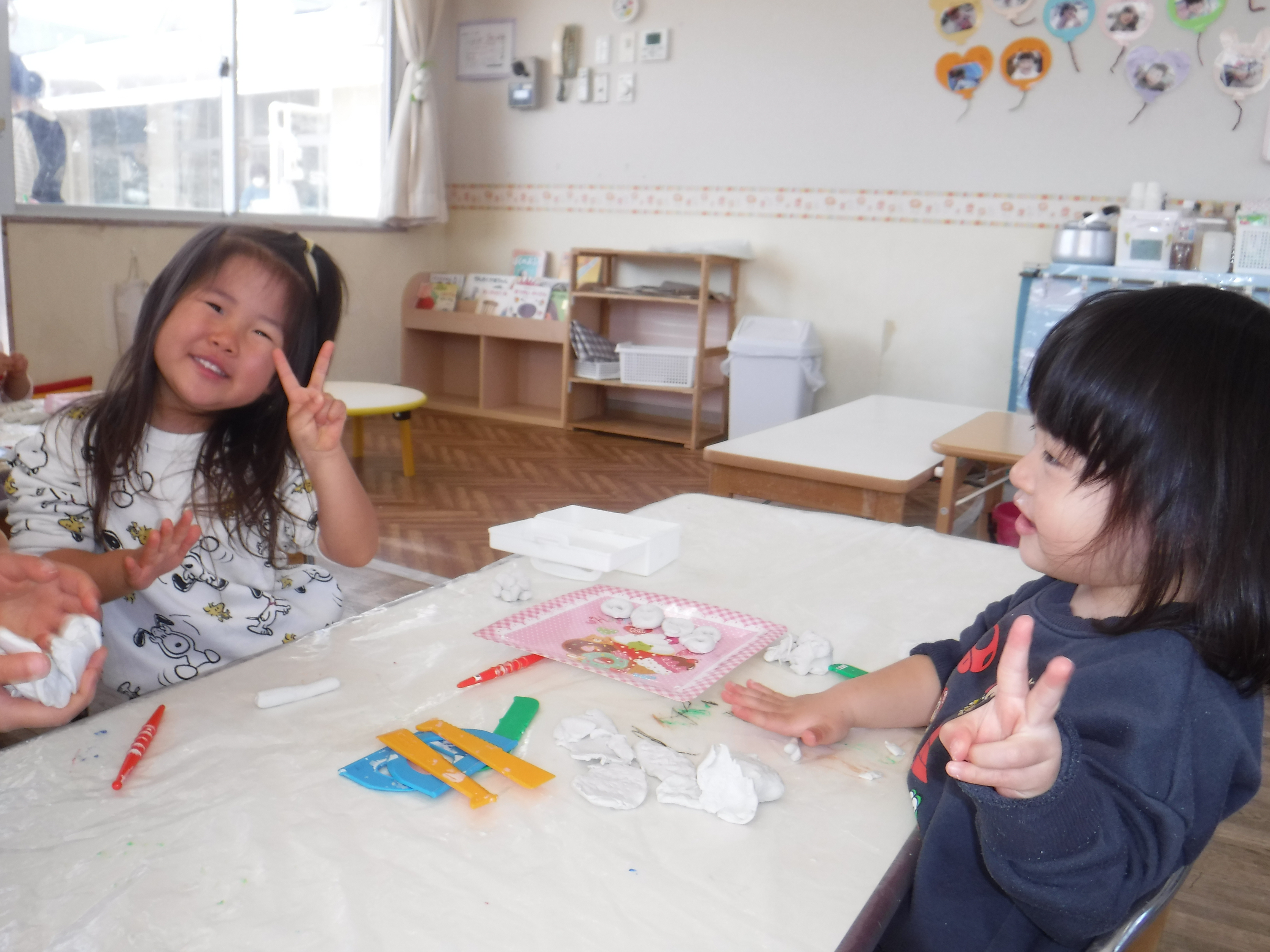 風が冷たかったからか外へ出る子は少なく室内での粘土遊びが大盛り上がり。粘土に粘土をはさみ餃子を作りながら「たね入れるんだよ」と作っている子、のばした棒を丸め「ドーナッツはいかがですか?」とお皿いっぱいに並べ友だちに進めている子、中には「へびだぞ~」遊ぶ姿も見られ細かい部分も作ることが出来るようになってきた姿に成長を感じました。
