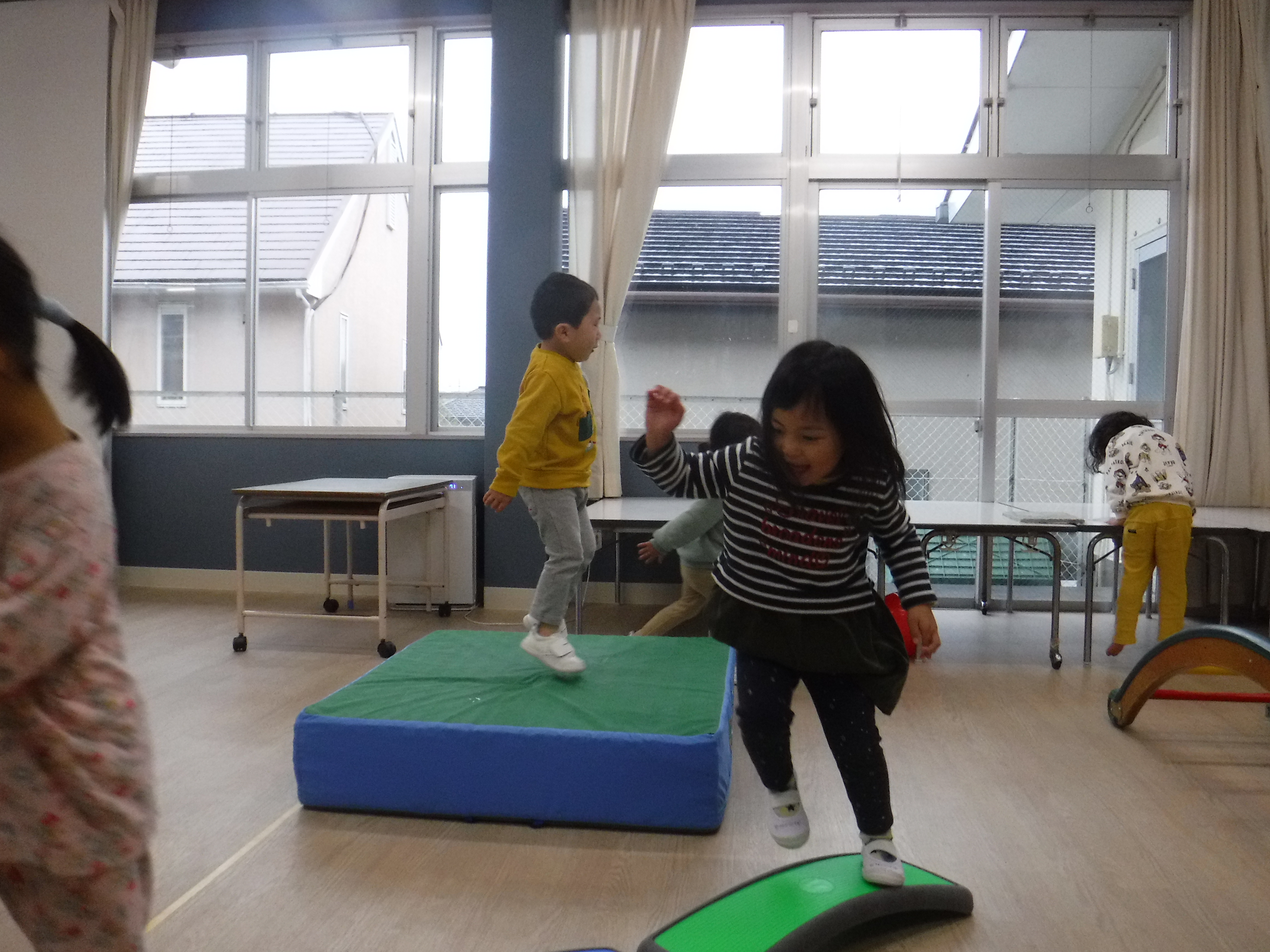 今日はあいにくの雨だったので、みんなで体を動かそうとみんなの部屋へと出かけたりすぐみさん。すべり台・ジャンピング・バランス板などを出すとあっちこっちからやり始め「どいて」と言い合ってしまったので「すべり台の方から順番にしよ」と伝えると並んで自分の順番を待ち楽しんでいました。
