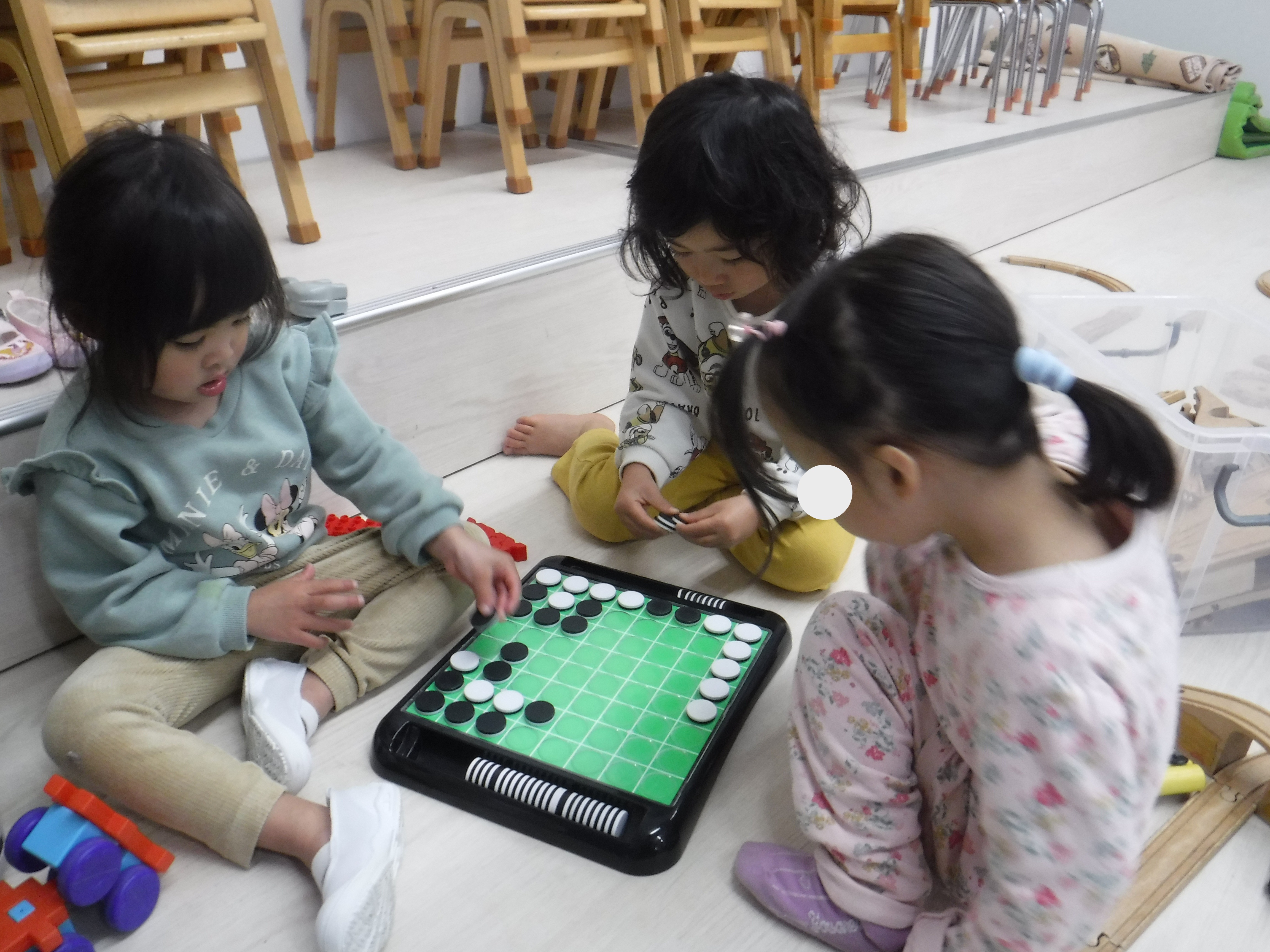 途中からは、それよりも舞台の上にあるいつもあまり使わないおもちゃが気になり始め、自分たちのルールでオセロを並べていましたよ。見ているとまるでゲームを楽しんでいるようでした。