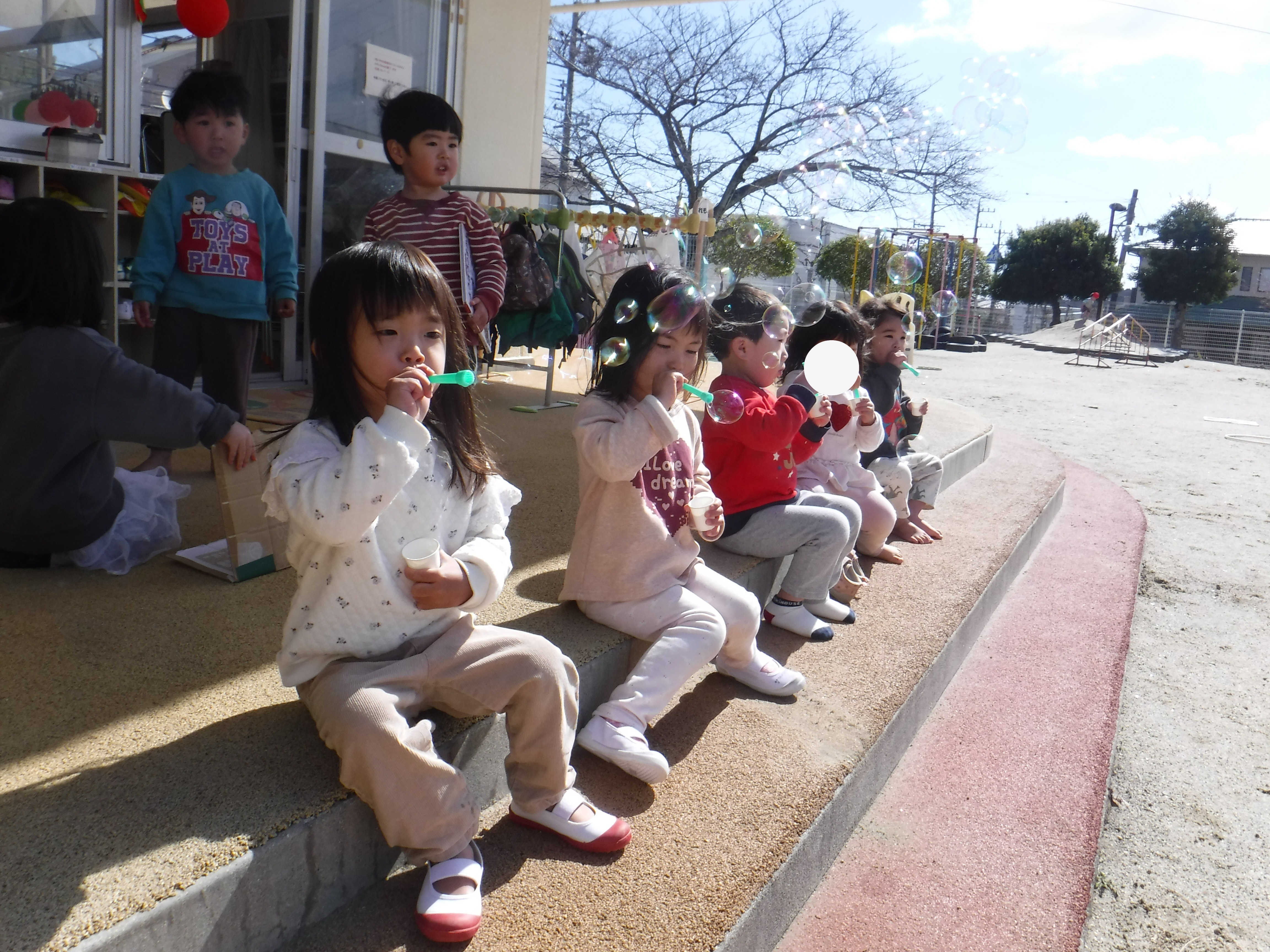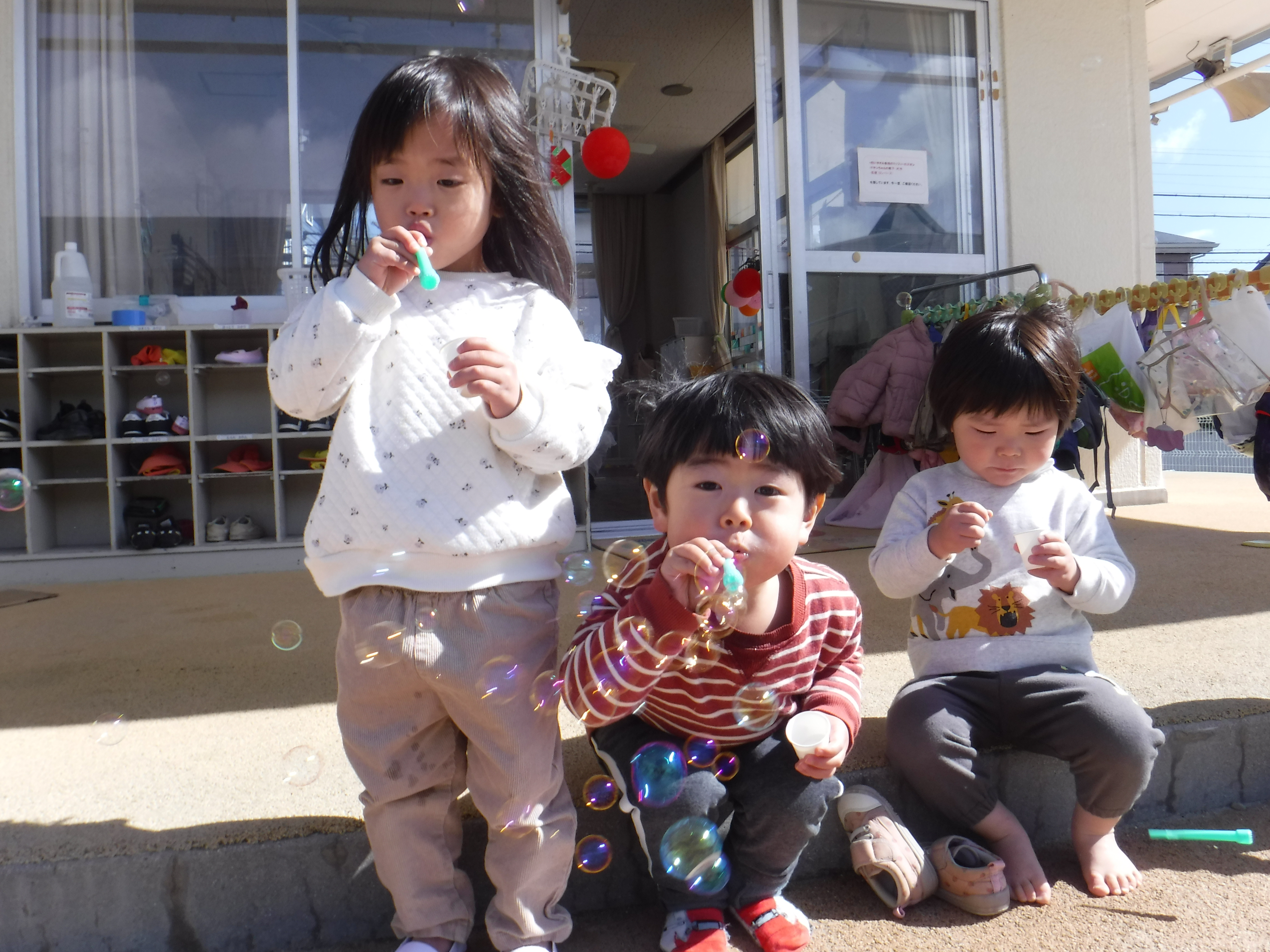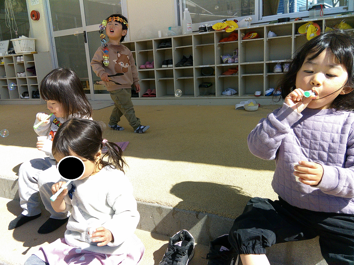 また、友だちの吹いたシャボン玉の後を追いかけ手で捕まえようとする子の姿も見られとても楽しそうでした。
