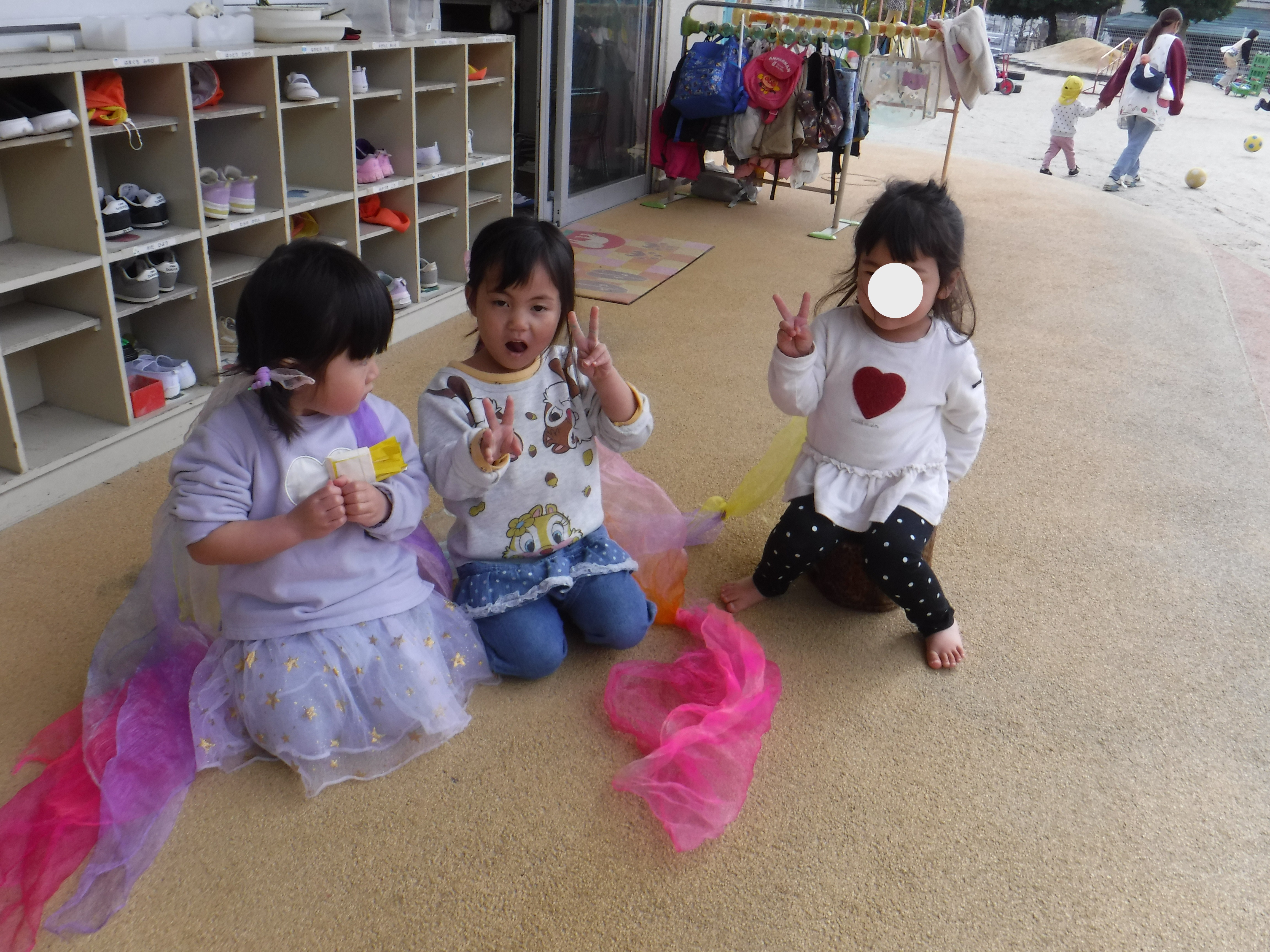室内ではそらぐみさんの遊ぶ様子を見て髪に布を長く付け、まるでプリンセスのようにしてテラスを走り回り、その布が風になびくのを楽しんだり、園庭では二輪車に荷物を乗せて押しながら、途中「こわれたので見てください」と言うと「はい」と言ってタイヤを全て触ってみて「なおったよ」とまるで小さな車屋さんのように遊んでいました。