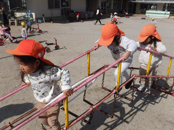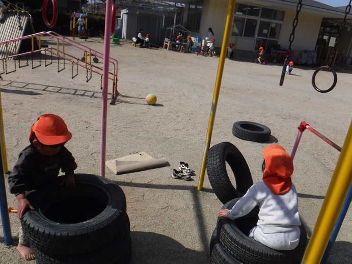 今日は天気がよく、過ごしやすい気候でしたね。登園してくると、「お外行こ~!」と友だちを誘い合って園庭へと出かけていくのでした。