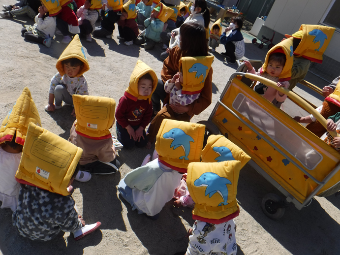 また、地震と火災の設定で避難訓練がありました。音がなるとすぐに遊んでいる玩具を置いて机の下に隠れ、防災頭巾も被り方を覚えたようで自分たちで被っていて驚きました!