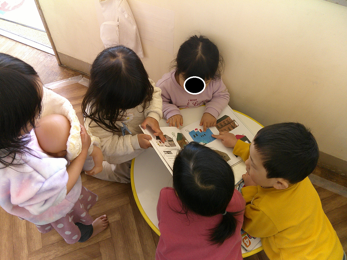 『質問絵本』に興味を示す、りすぐみさん。正解が無く人の絵を見て直感で質問に答えるといった話です。一番お金持ちに見える人は誰という質問で、サングラスをして帽子を被っている人を指差したのでなぜかと尋ねてみると「サングラスしてるし、ポケットに手を入れてるからかっこいい!」などと、きちんと理由があるこどもたちで面白かったですよ。