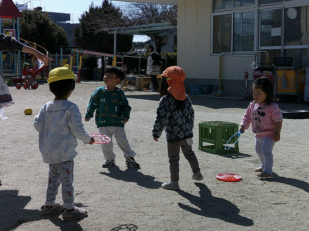 吹いたシャボンがあちこちに飛んでいくのが面白かったようです。追いかけようとしても追いつけなくて「あ~!」と言いながら笑って風を楽しんでいる子ども達でした。