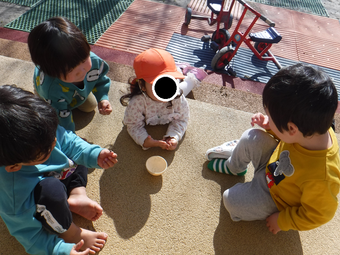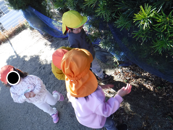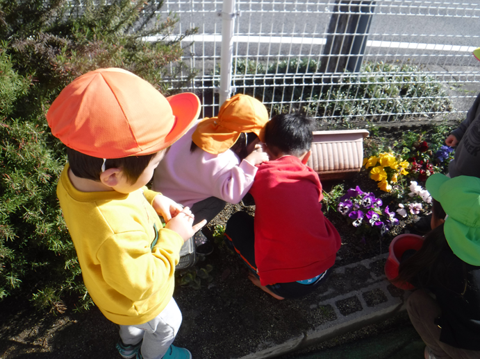 少しずつ暖かい日が多くなってきたからか、ダンゴムシを見つけた子が!その後、みんなでダンゴムシ探しが始まります。「どこにいるかな?」と探しますが中々見つからず…。すると、この下にいるんじゃない?と花壇の下を見ると、たくさん発見!大事に虫かごに入れて持ち歩き、みんなで観察をして楽しみました。