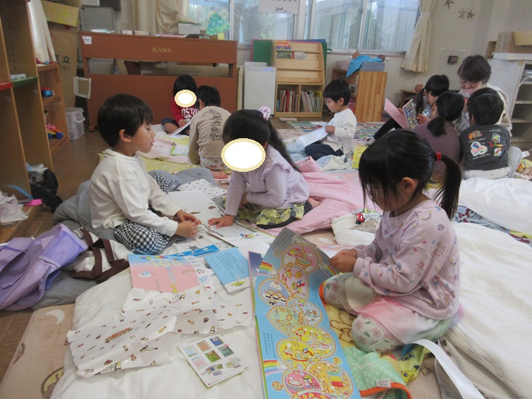 給食を食べてお部屋に帰るとプレゼントが!!「誰かがプレゼントをもってきてくれたんだね」と保育士が言うと「サンタさんかな??」「おと先生かな」と子ども同士で誰からもらったのか話したり、「やったー♪何だろう♪」と喜んでいました。包装紙をあけ友だちや先生と興味津々で読むこどもたちでしたよ。